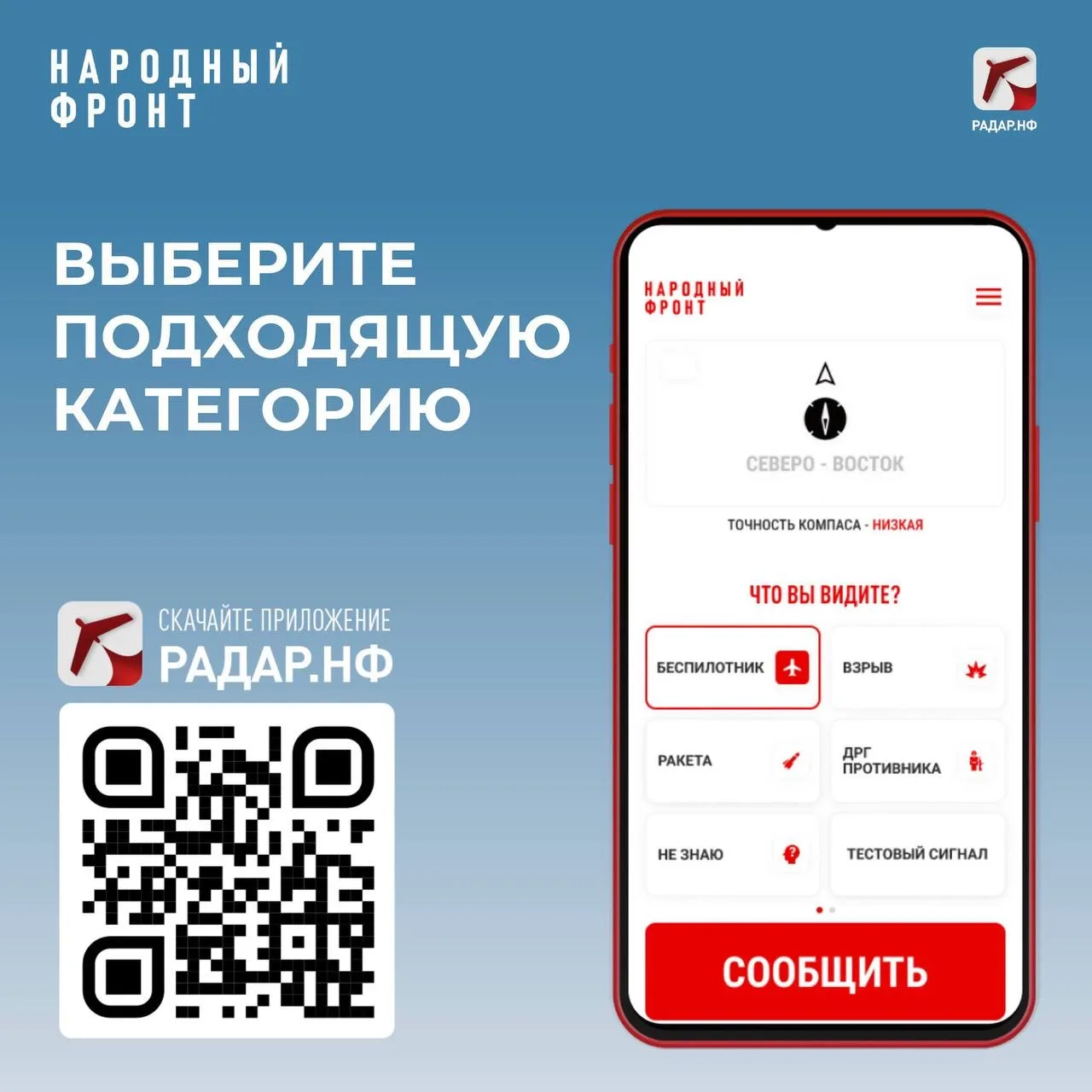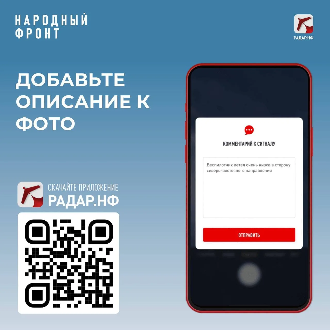 Ваша безопасность – в ваших руках! Если вы увидели в небе беспилотник, сообщите о нем спецслужбам с помощью мобильного приложения "Радар.НФ". Оно разработано для оперативной передачи информации о подозрительных объектах, взрывах и других инцидентах. Ваши сообщения помогают службам безопасности своевременно реагировать на потенциальные угрозы.