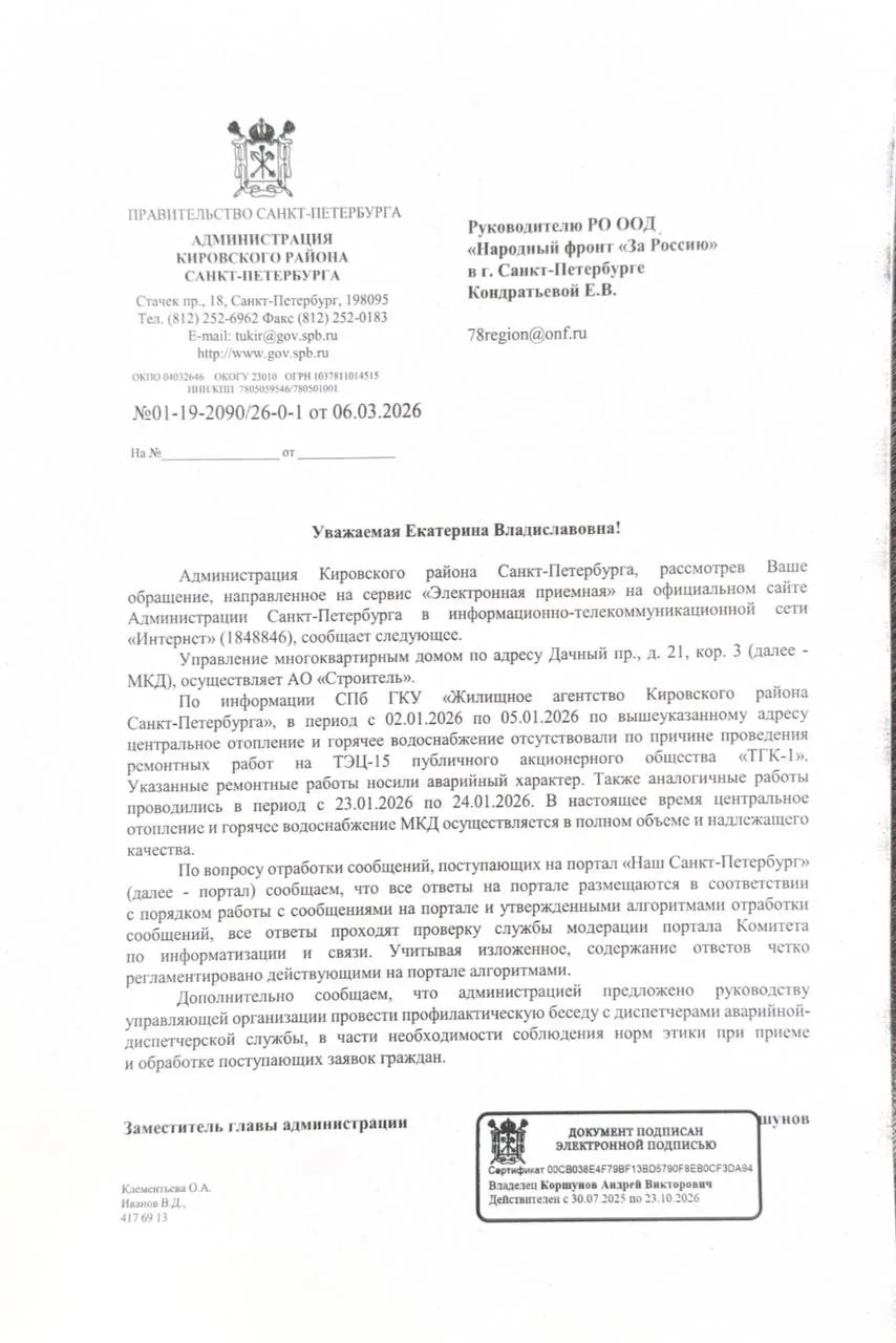Жители неоднократно сообщали о перебоях с теплом и горячей водой в доме на Дачном проспекте, дом 21, корп.3. Причиной стали аварийные ремонтные работы на ТЭЦ, из-за которых дома временно оставались без коммунальных услуг.
