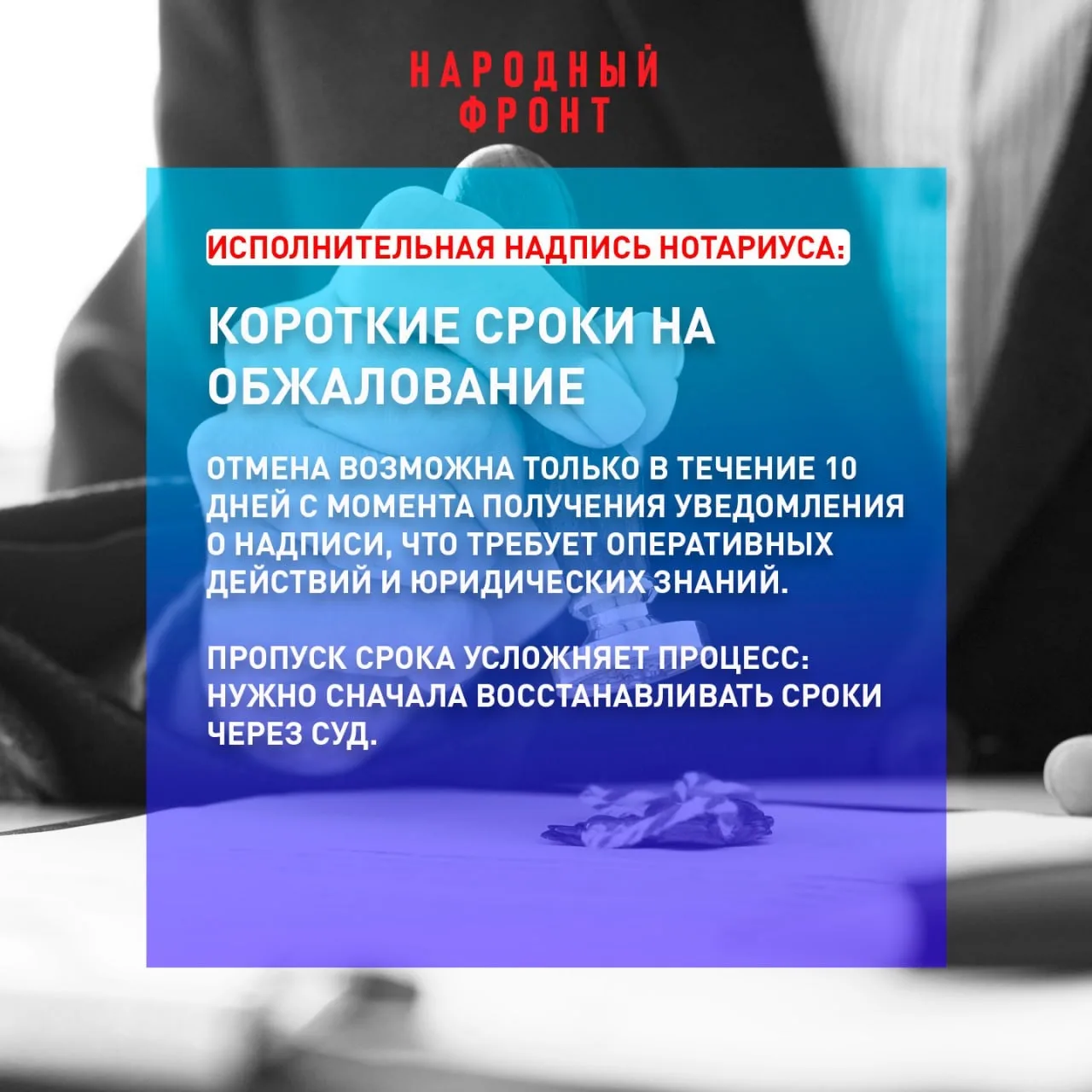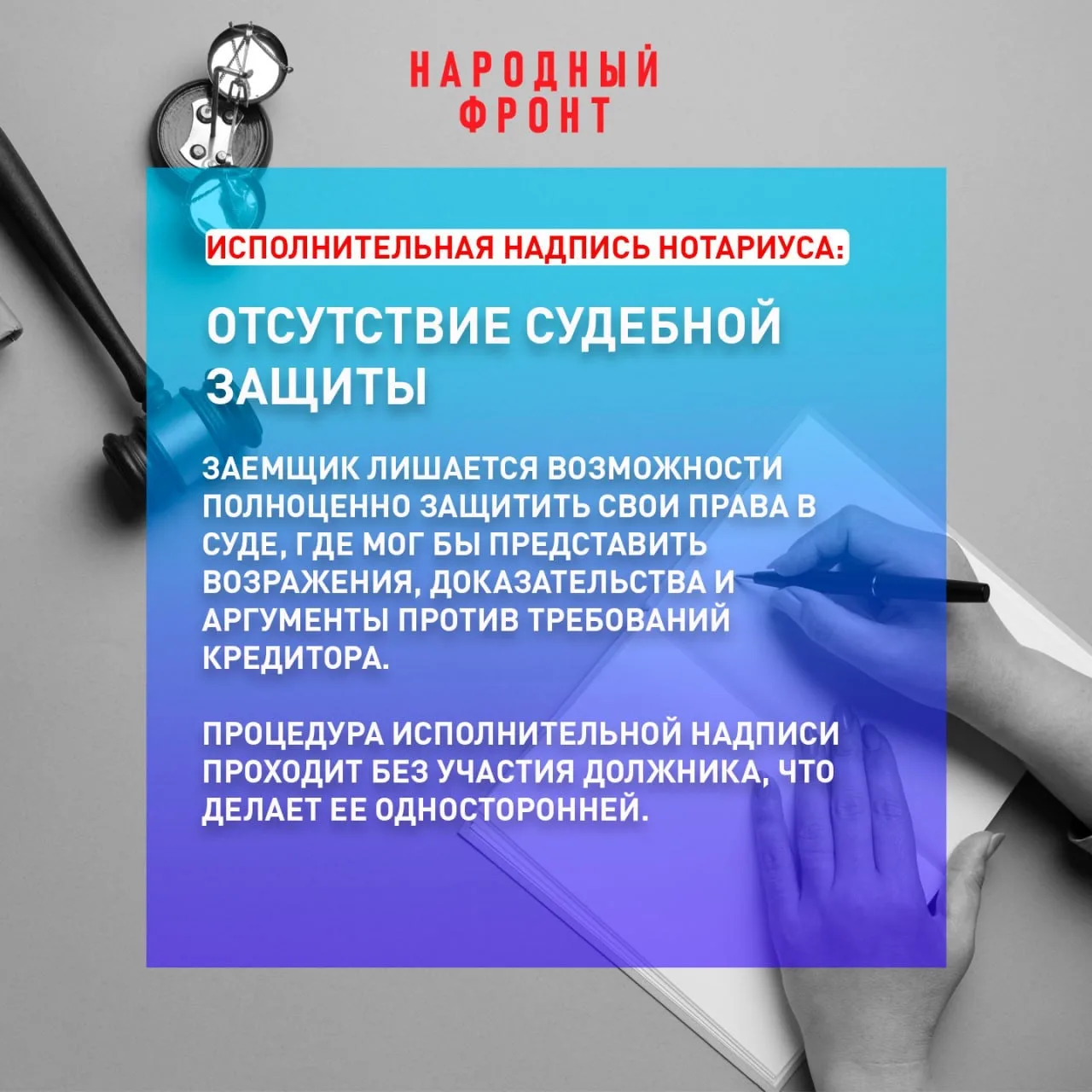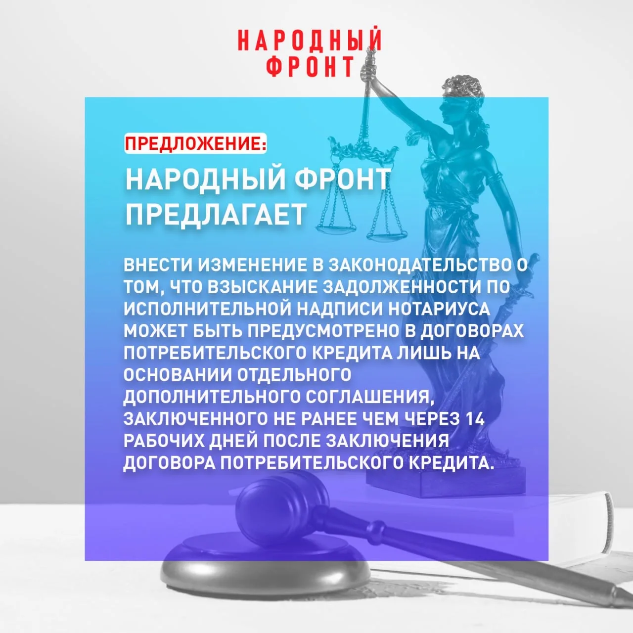 Народный фронт добивается ограничения упрощённого взыскания долгов через исполнительную надпись нотариуса. Законопроект представителя НФ Андрея Рябоконя предусматривает применение этой процедуры только по отдельному соглашению — не ранее чем через 14 рабочих дней после заключения кредитного договора.