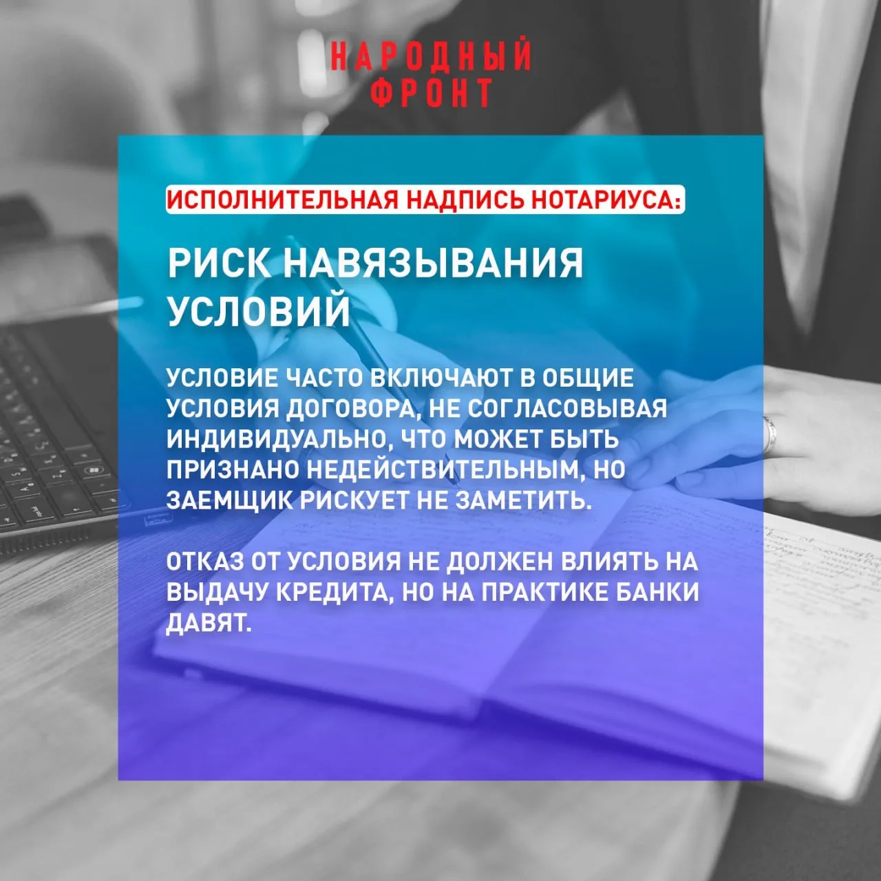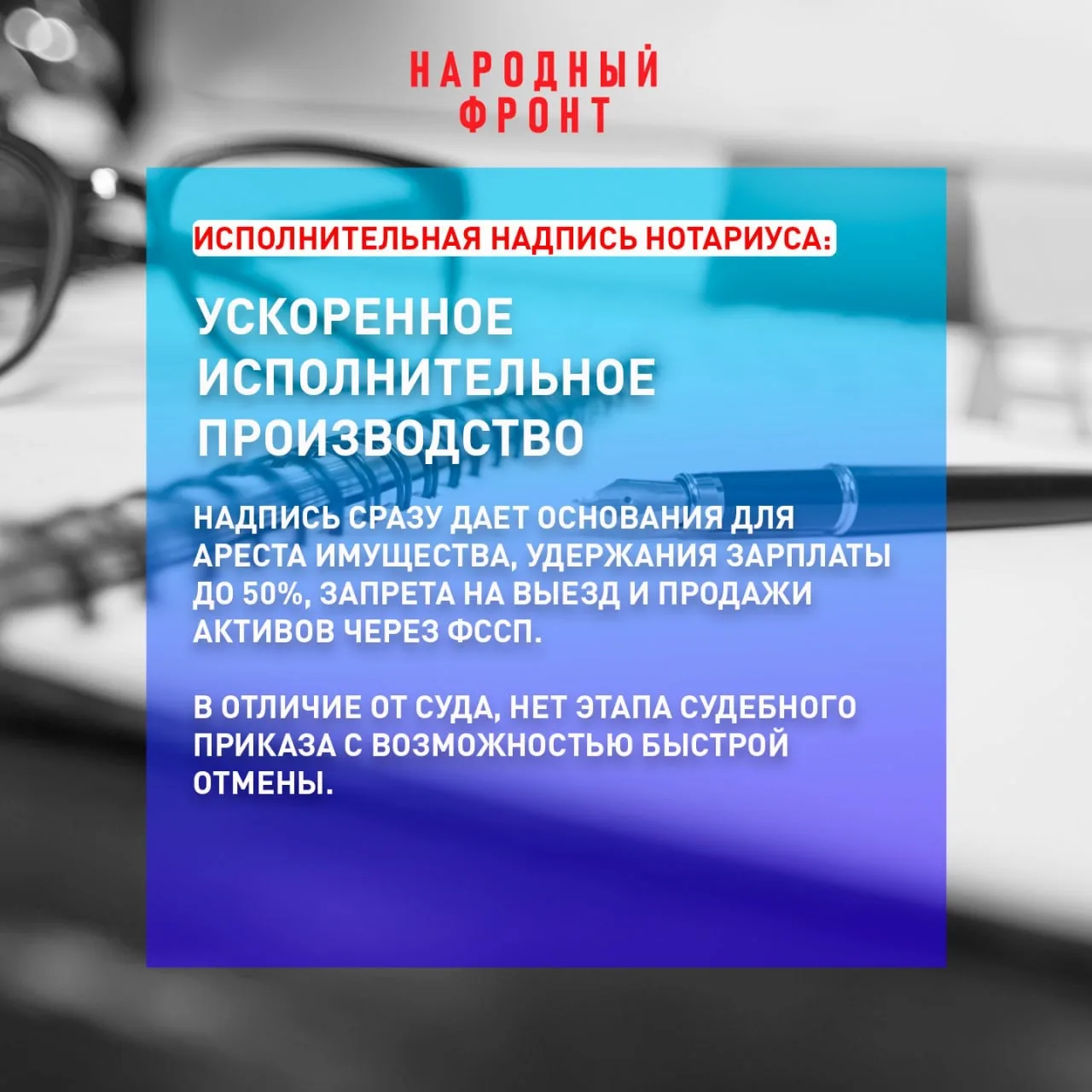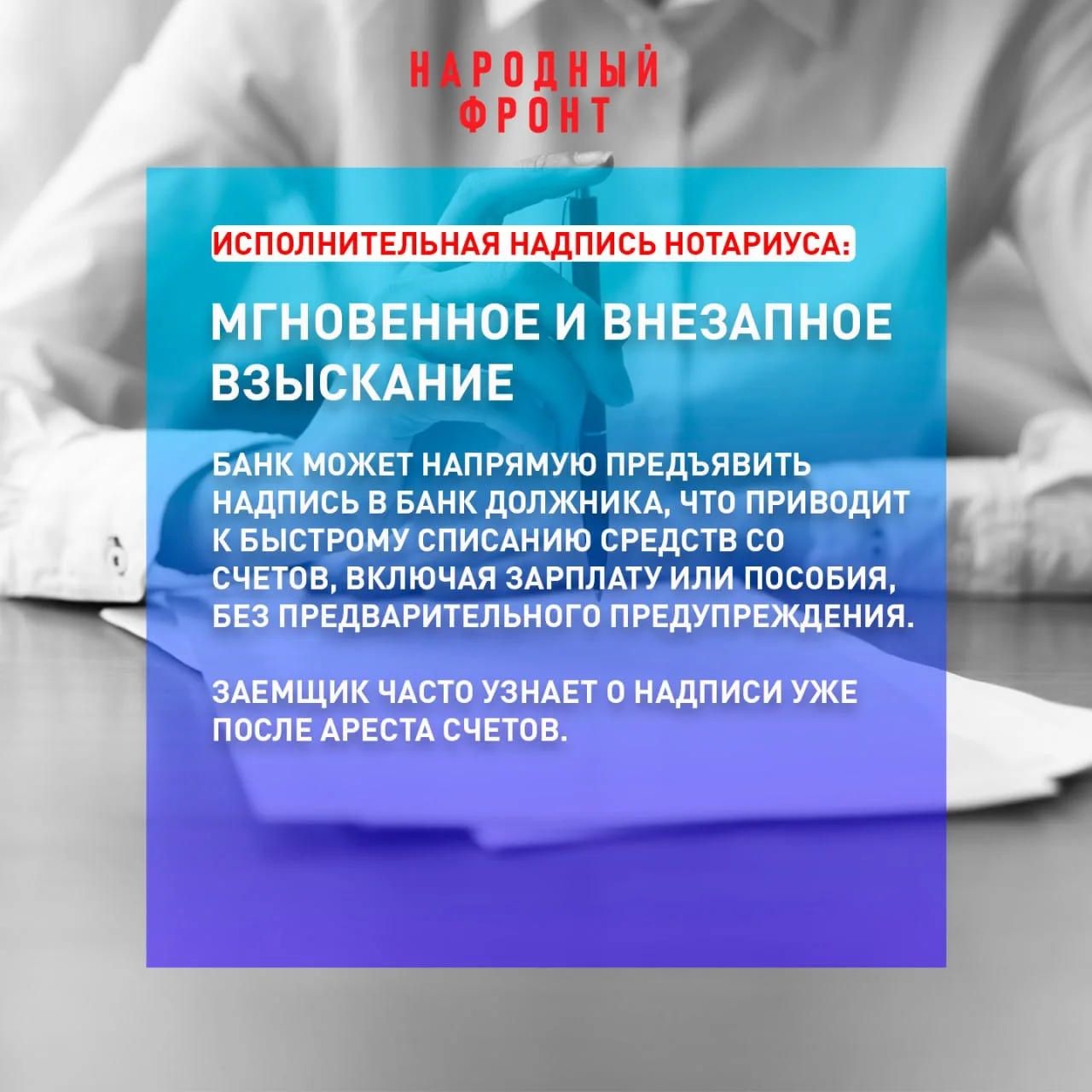 Народный фронт добивается ограничения упрощённого взыскания долгов через исполнительную надпись нотариуса. Законопроект представителя НФ Андрея Рябоконя предусматривает применение этой процедуры только по отдельному соглашению — не ранее чем через 14 рабочих дней после заключения кредитного договора.