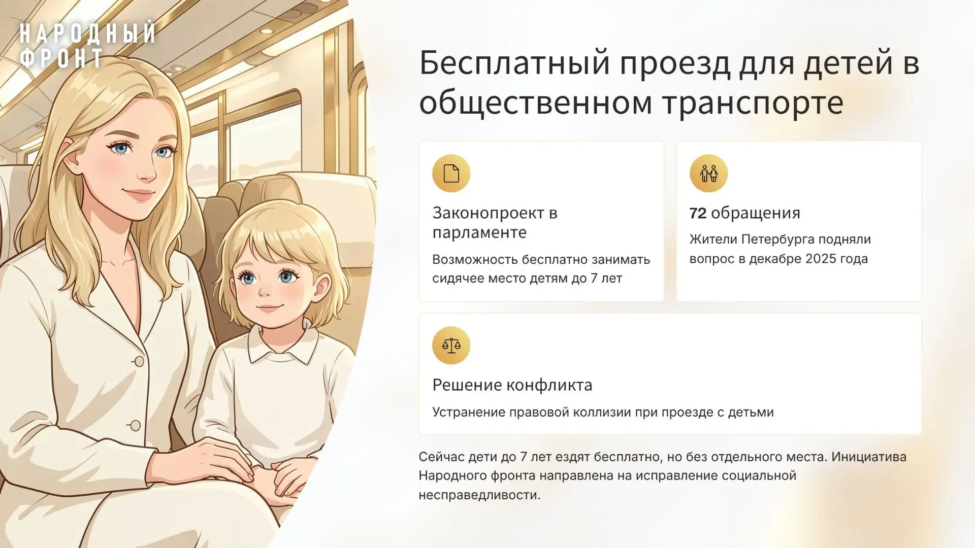 После анализа 72 обращений, поступивших на прямую линию с Президентом, Народный фронт предложил разрешить детям до 7 лет бесплатный проезд с правом занятия сидячего места. Инициатива направлена на устранение правовой неопределённости и снижение конфликтов в общественном транспорте.