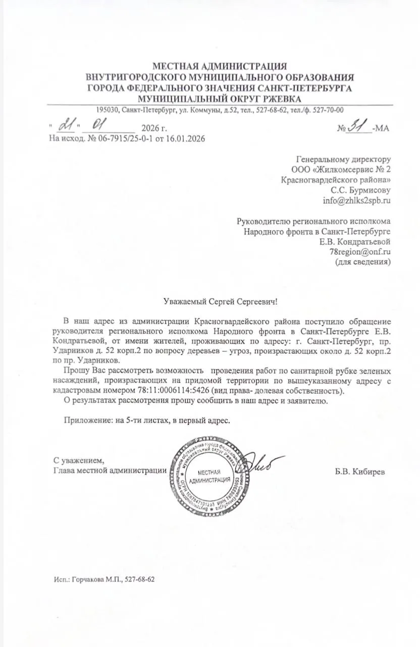 После обращения Народного фронта администрация Красногвардейского района направила в ООО "Жилкомсервис № 2 Красногвардейского района" запрос на проведение санитарной рубки зелёных насаждений, представляющих угрозу, на придомовой территории дома № 52, корп. 2 по проспекту Ударников.