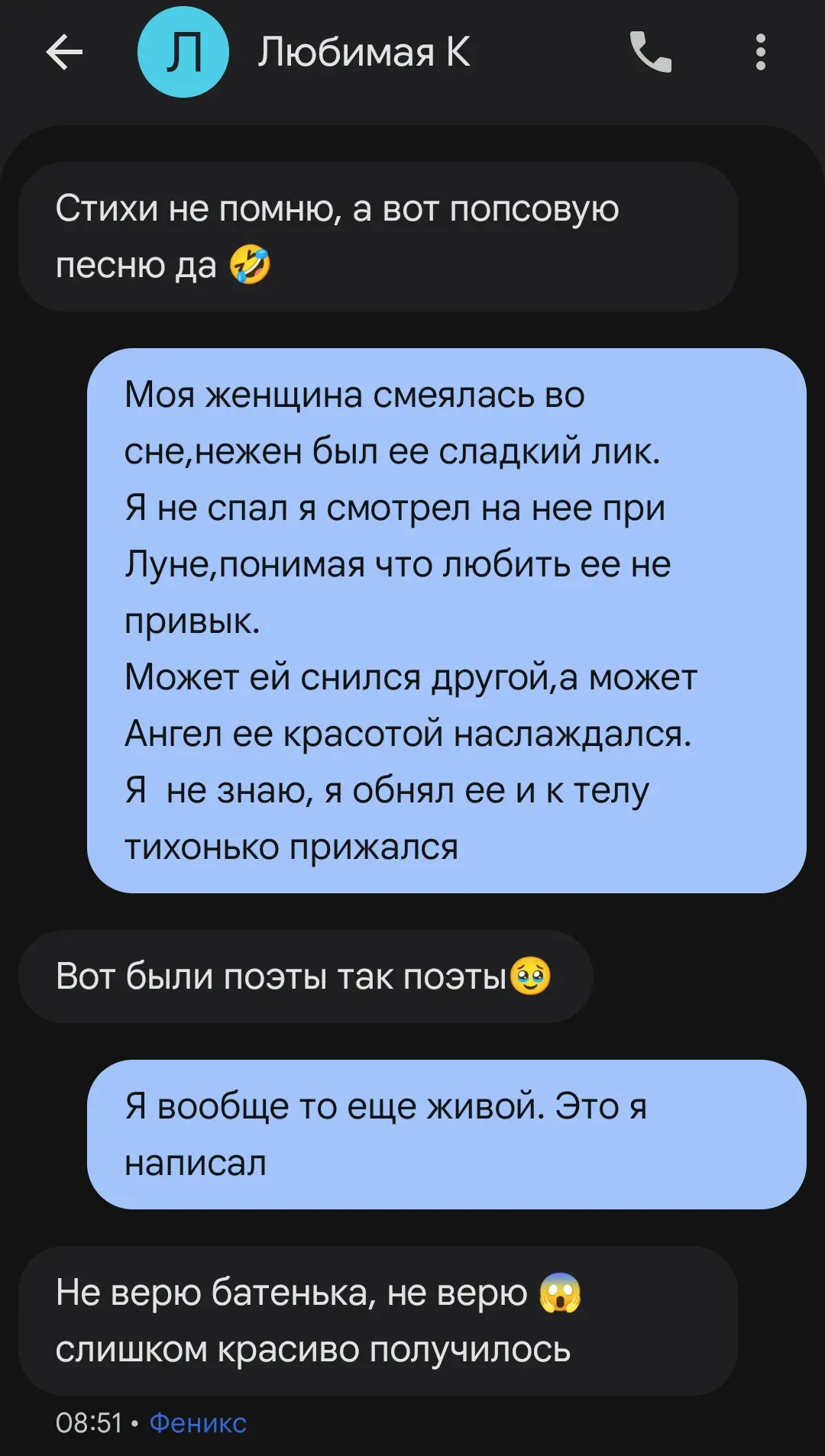 Разделяю себя на семью, работу, и желание писать, но как ни крути таланта во мне нет. Сейчас талант это соцсети и бессмысленное кривляние, которое почему-то всем нравится. Не знаю правильным ли я путём иду, но глупостей в моем телефоне давно стало меньше. Книги, музыка и записная книжка, больше ничего наверное не нужно в телефоне. Поговорить бы по душам с кем нибудь, но это сейчас большая роскошь.