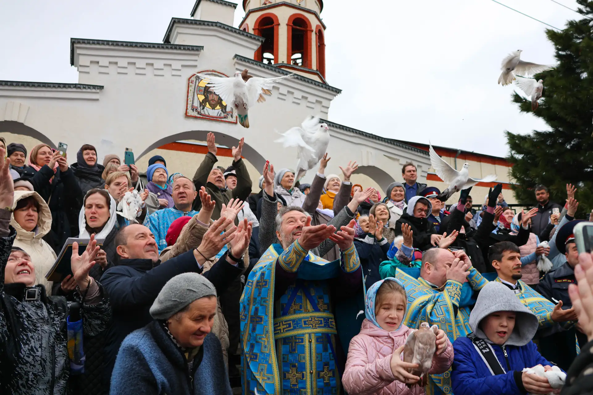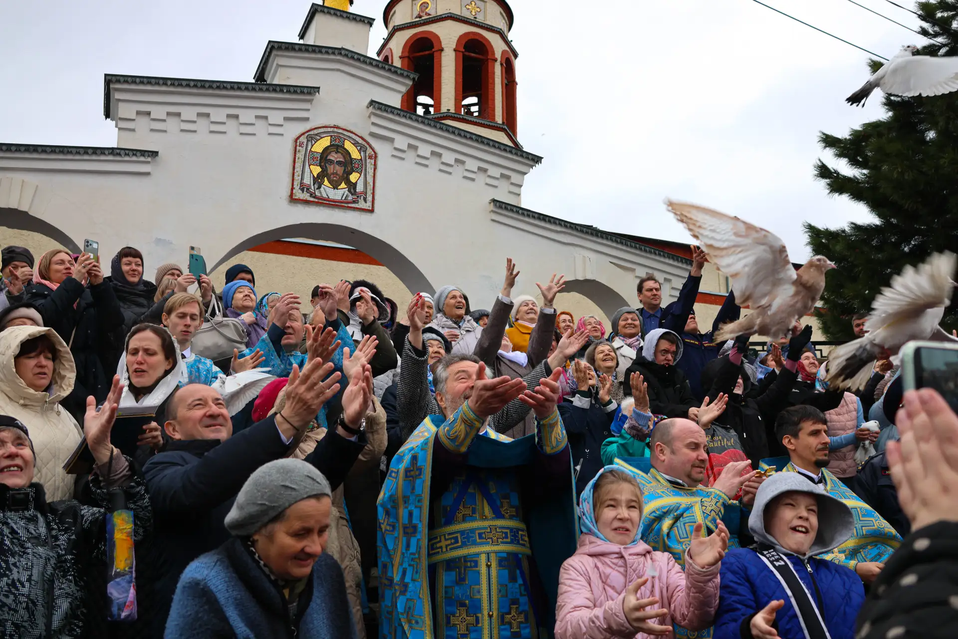 Сегодня в храмах нашего города проходят особые праздничные богослужения. По традиции, в завершение службы в небо выпускаются белые голуби — в христианстве эта птица символизирует Святого Духа, мир и добрую весть.