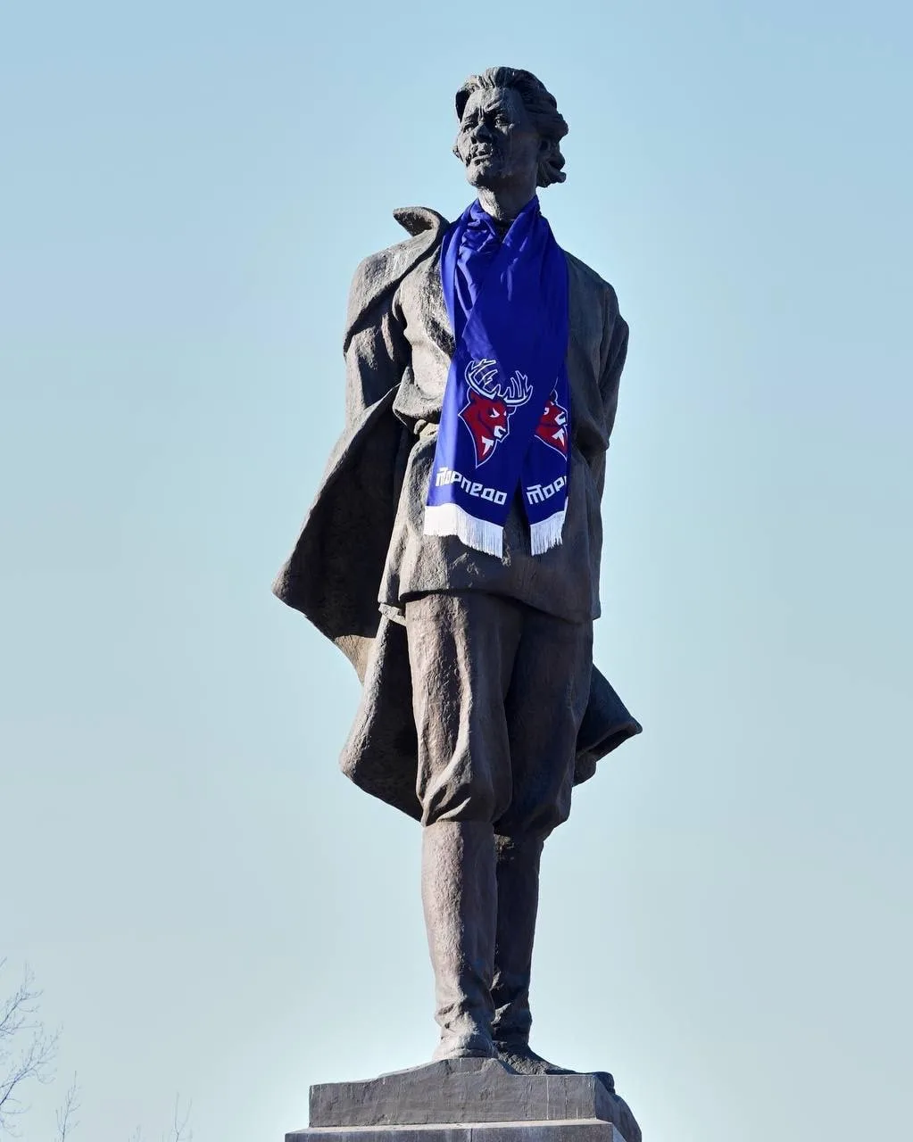 На памятнике писателю появился шарф нашего клуба. Напомним, уже в понедельник «Торпедо» вступит в борьбу за Кубок Гагарина матчами против Северстали.