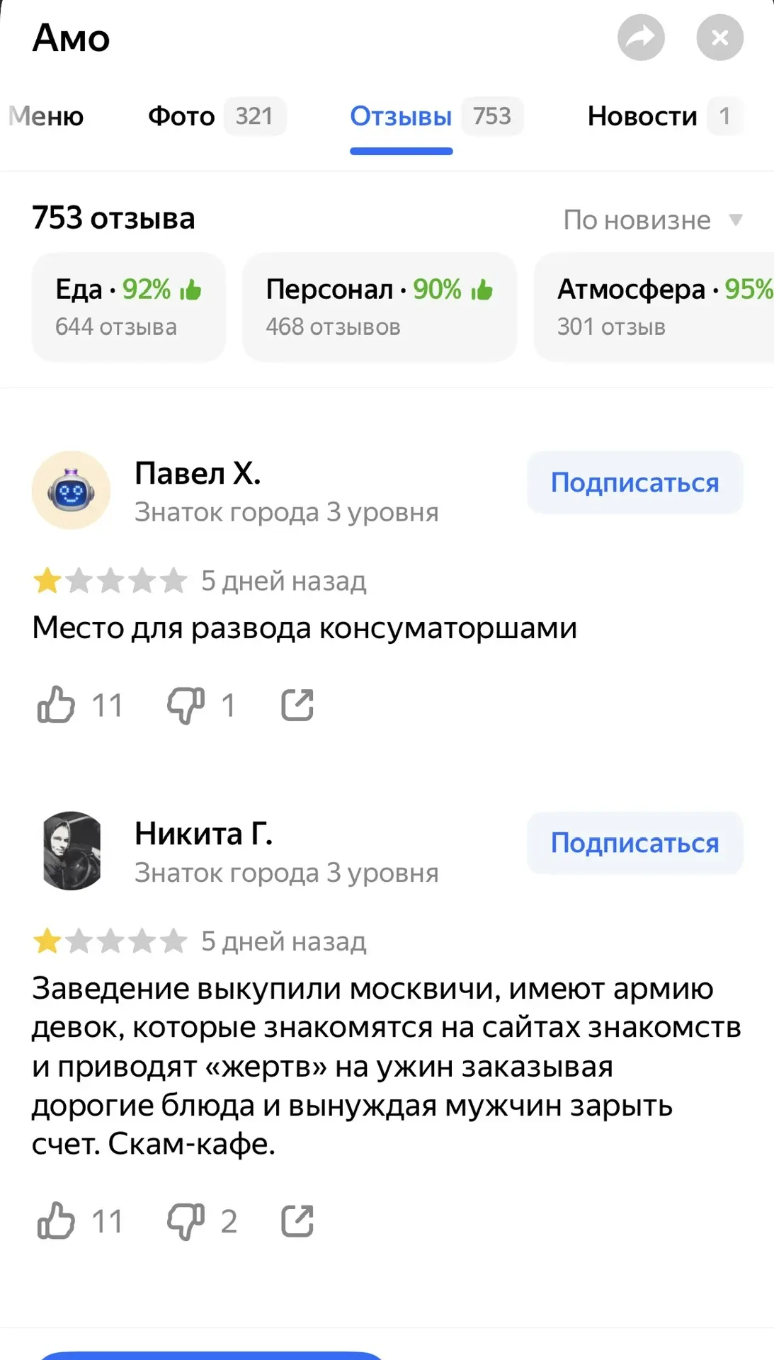 Друзья, всегда будьте внимательны при посещении таких подозрительных мест с малознакомыми людьми. Просите меню, ругайтесь, защищайте свои права! Это точно не последний такой кейс. У меня на канале есть обзоры почти всех заведений города. После их закрытия я всегда добавляю соответствующую информацию к обзору. Вы найдёте любой ресторан по поиску на канале и его текущий статус. А если что-то смущает - пишите мне напрямую✍️