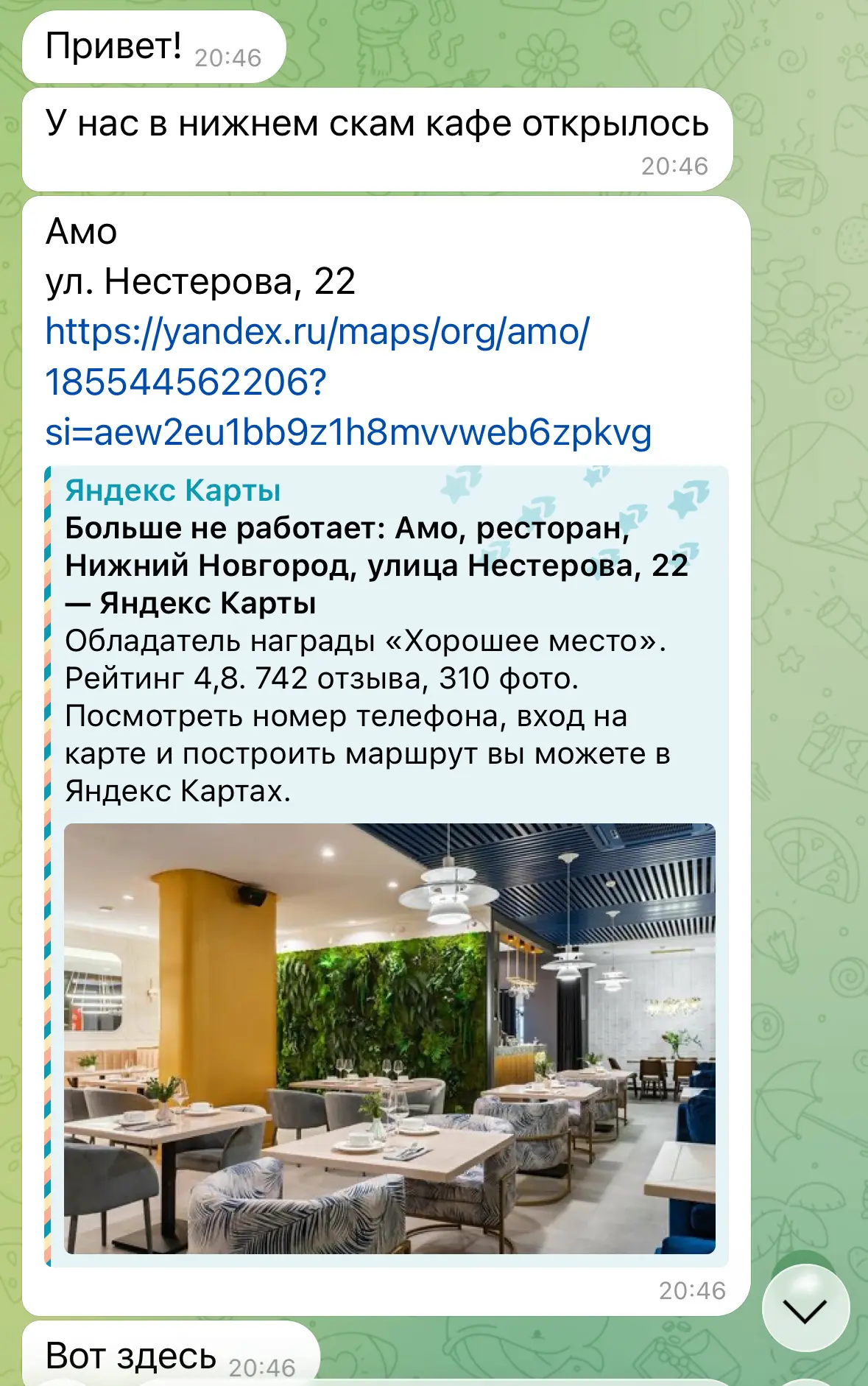 Как мне удалось узнать, этот ресторан выкупили некие лица из Москвы. Они нанимали красивых девушек, в работу которых входило знакомство с молодыми и наивными нижегородскими парнями и далее назначение свиданий в этом самом «АМО»👩❤️👨