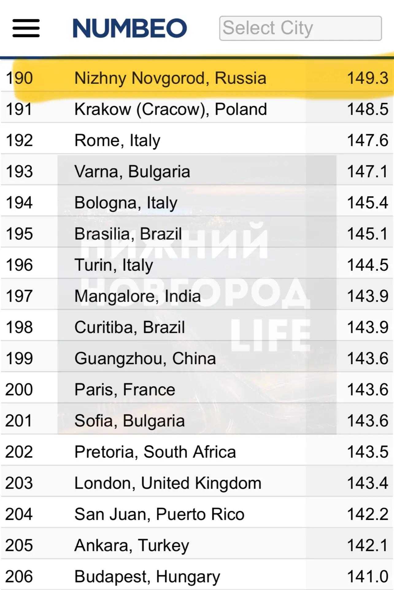💪Нижний Новгород занял 190 место среди 304 городов мира в рейтинге Numbeo по качеству жизни.