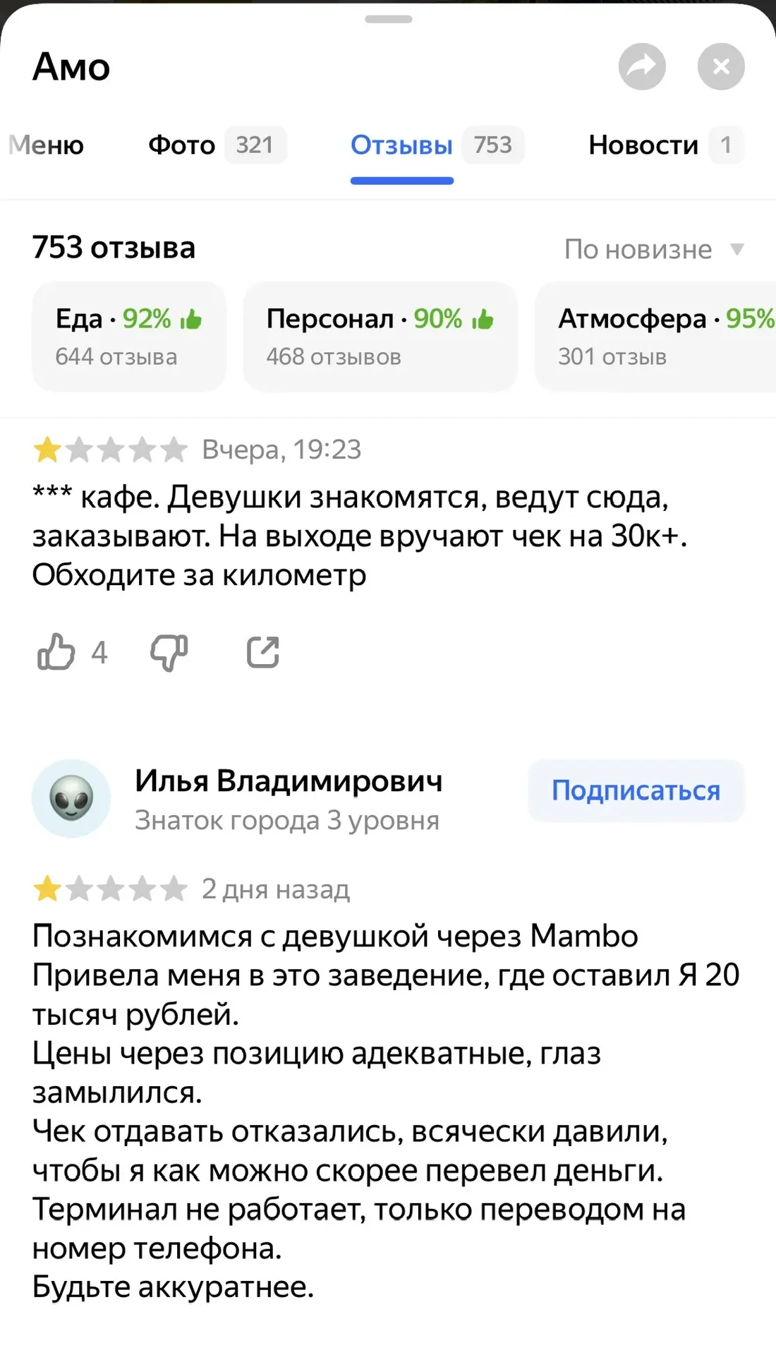 Ну а затем стандартная мошенническая схема: салатик «Цезарь» и два капучино обходились ребятам в 20-40 тысяч рублей💸 Меню не предоставляли, только приносили счёт с огромными цифрами. Ну и нашим наивным джентельменам приходилось всё оплачивать.