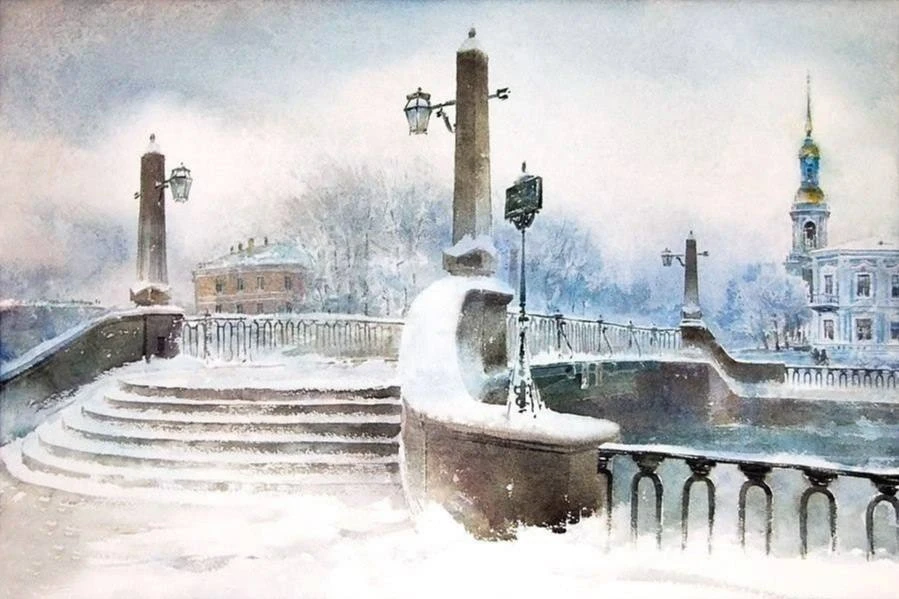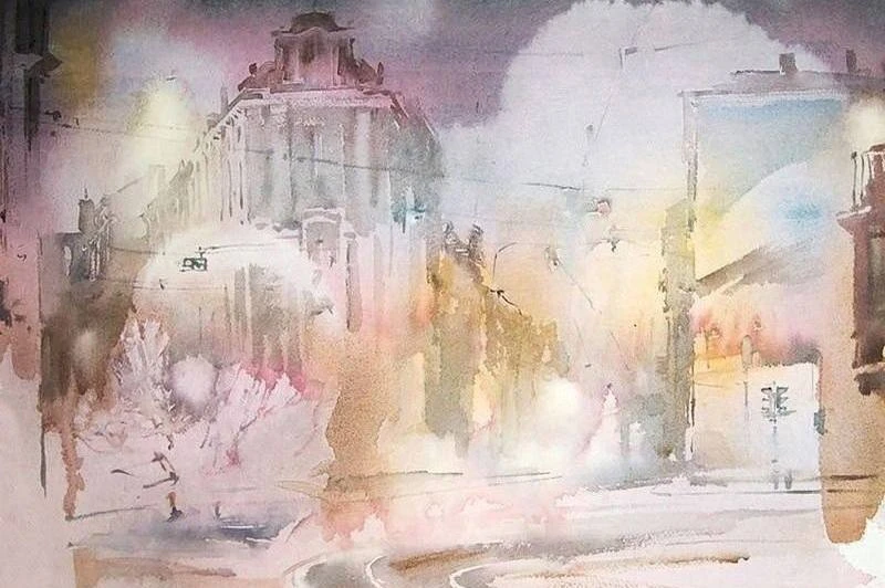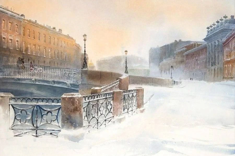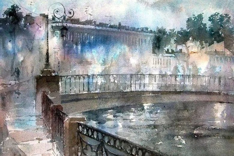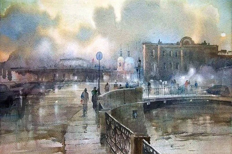 В его работах — туман над каналами, блеск мокрой мостовой и мягкий вечерний свет. Несколько прозрачных слоёв краски — и вот уже улица дышит, а дом чуть наклоняется в сторону Невы, словно прислушивается к ветру.