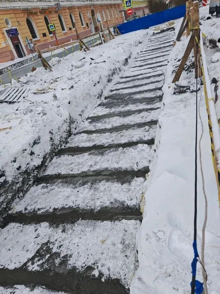 В этот раз после обильного снегопада случилась оттепель — рабочие не успели, и на улицах образовалась ледяная корка. Сейчас идёт расчистка лестницы от городского бассейна к виадуку. На уборке с раннего утра заняты четыре человека (всего у подрядчика 10–15 сотрудников).