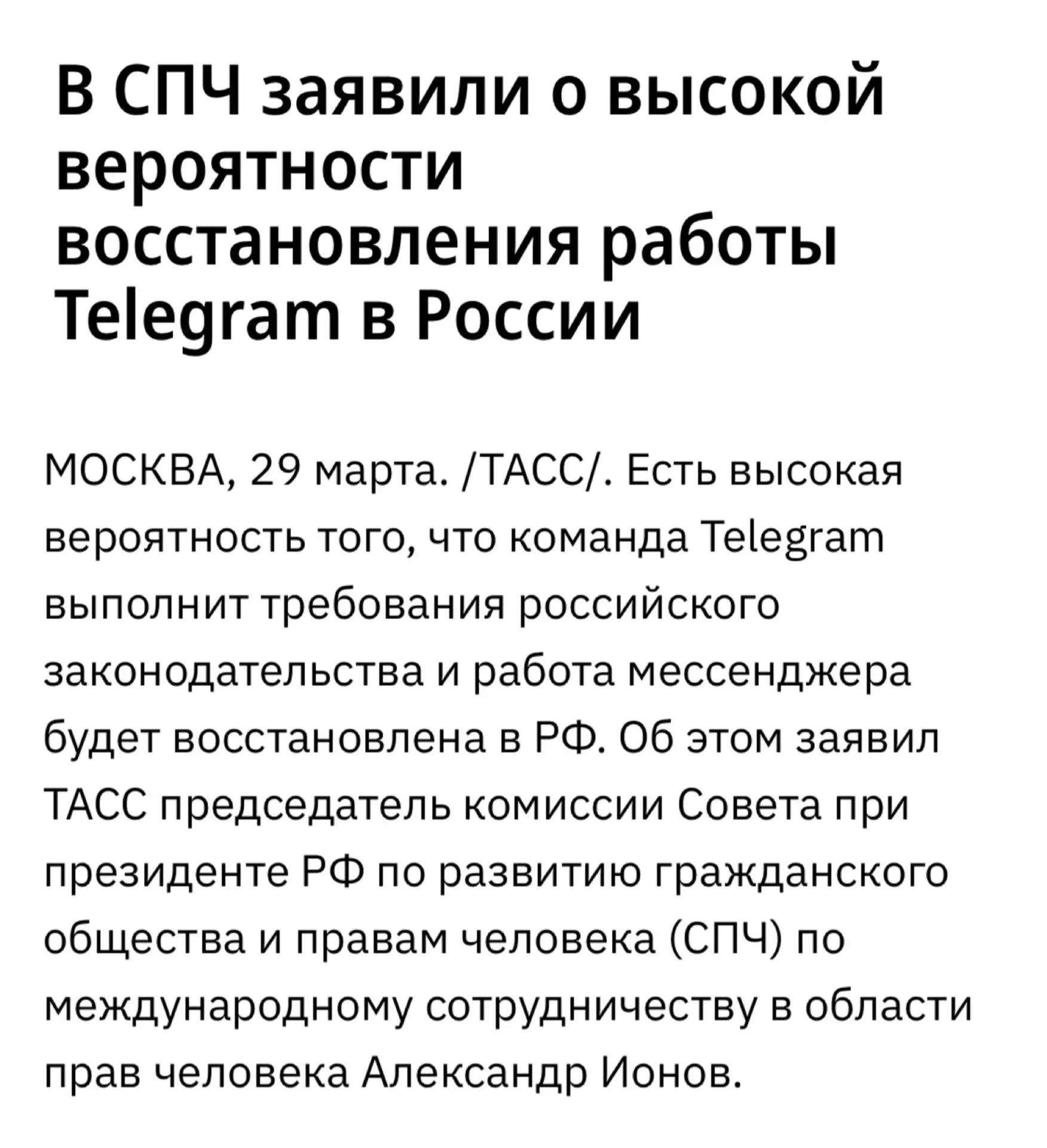 Совет по правам человека озвучил оптимистичный прогноз относительно работы Telegram в России: