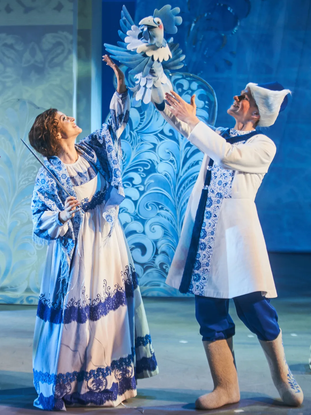 Декорации спектакля напоминают морозные узоры на стекле, костюмы отсылают к гжельской росписи, а волшебная музыка и голоса погружают зрителей в настоящую зимнюю сказку о том, что добро всегда вознаграждается!