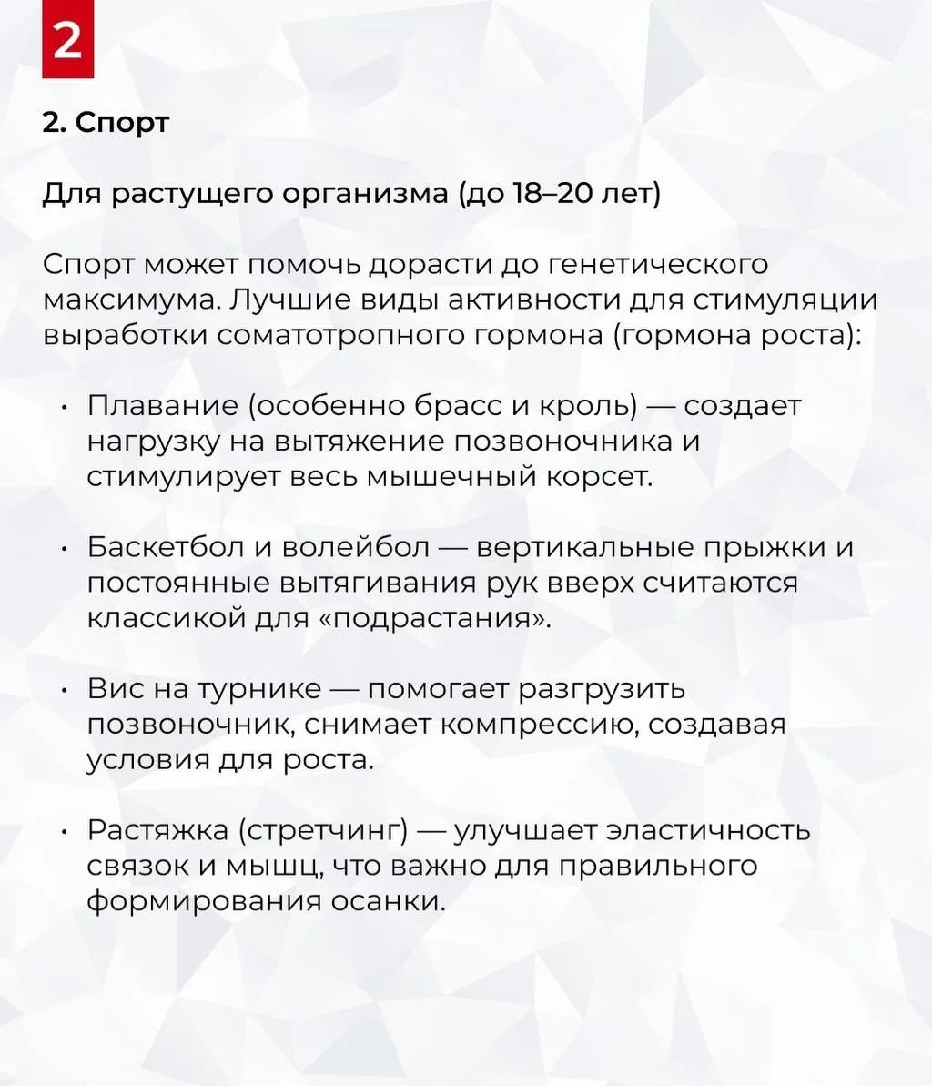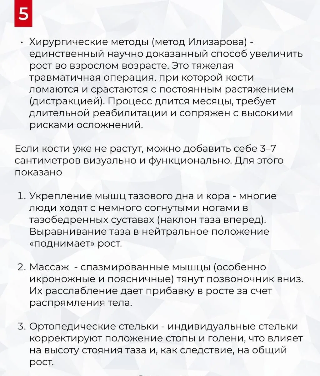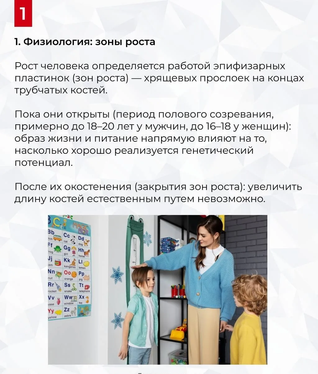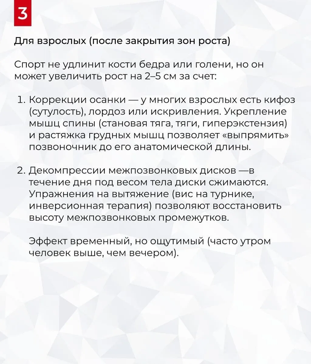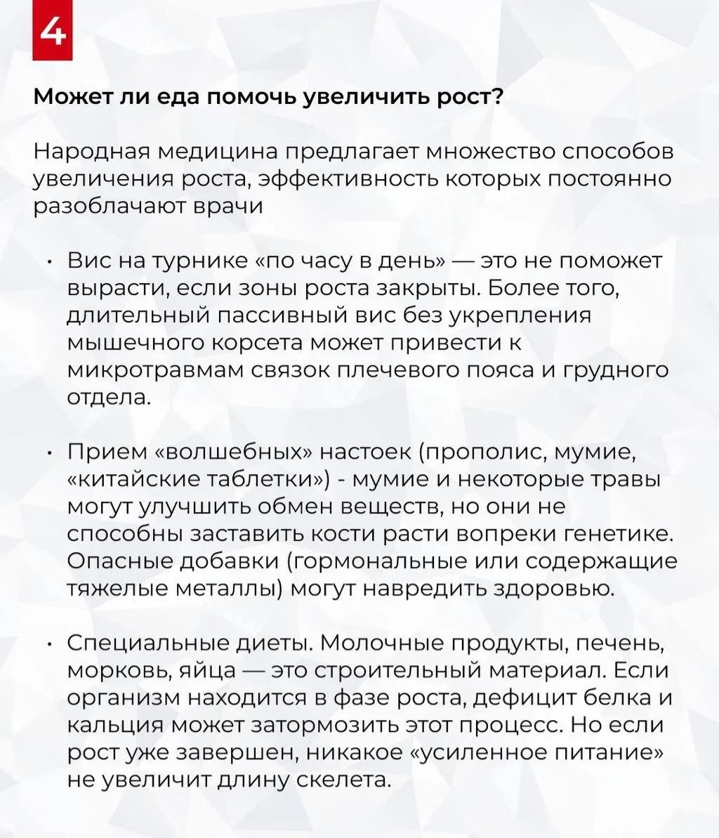 Значительно увеличить рост после закрытия зон роста во взрослом возрасте невозможно. Однако с помощью спорта и образа жизни можно «выжать» максимум из заложенного природой, улучшить осанку и визуально стать выше. Об этом рассказал врач- эндокринолог Калинчев в карточках.