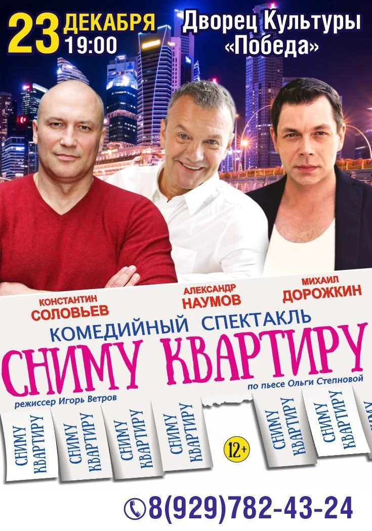 23 декабря в 19:00 на сцене ДК "Победа»– уморительная комедия "Сниму квартиру" с Константином Соловьевым, Александром Наумовым и Михаилом Дорожкиным!
