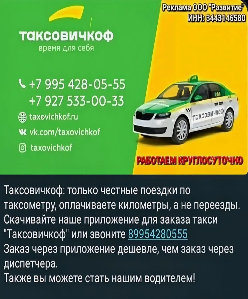 Скачивайте наше приложение для заказа такси "Таксовичкоф" или звоните 89954280555