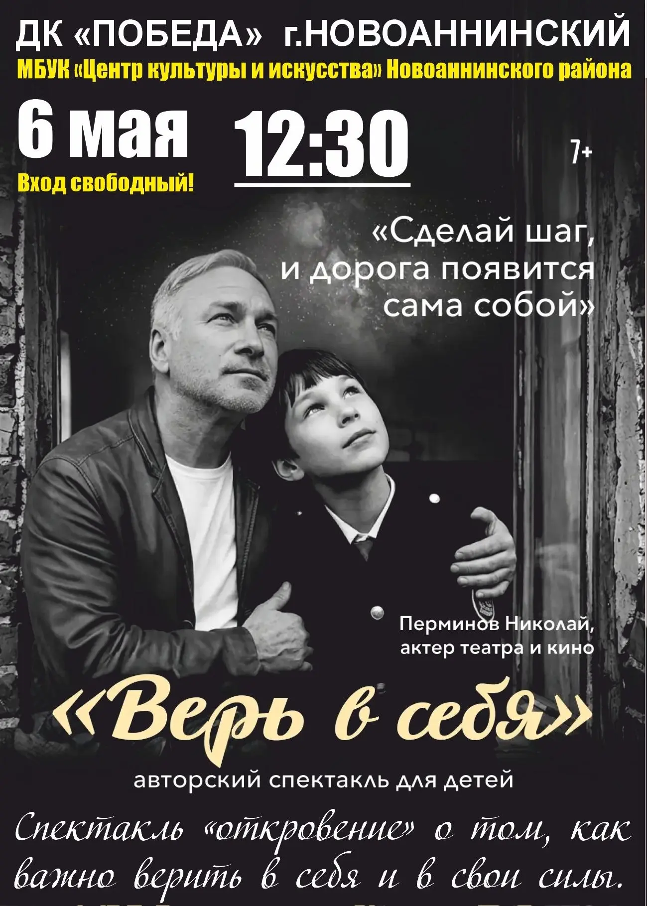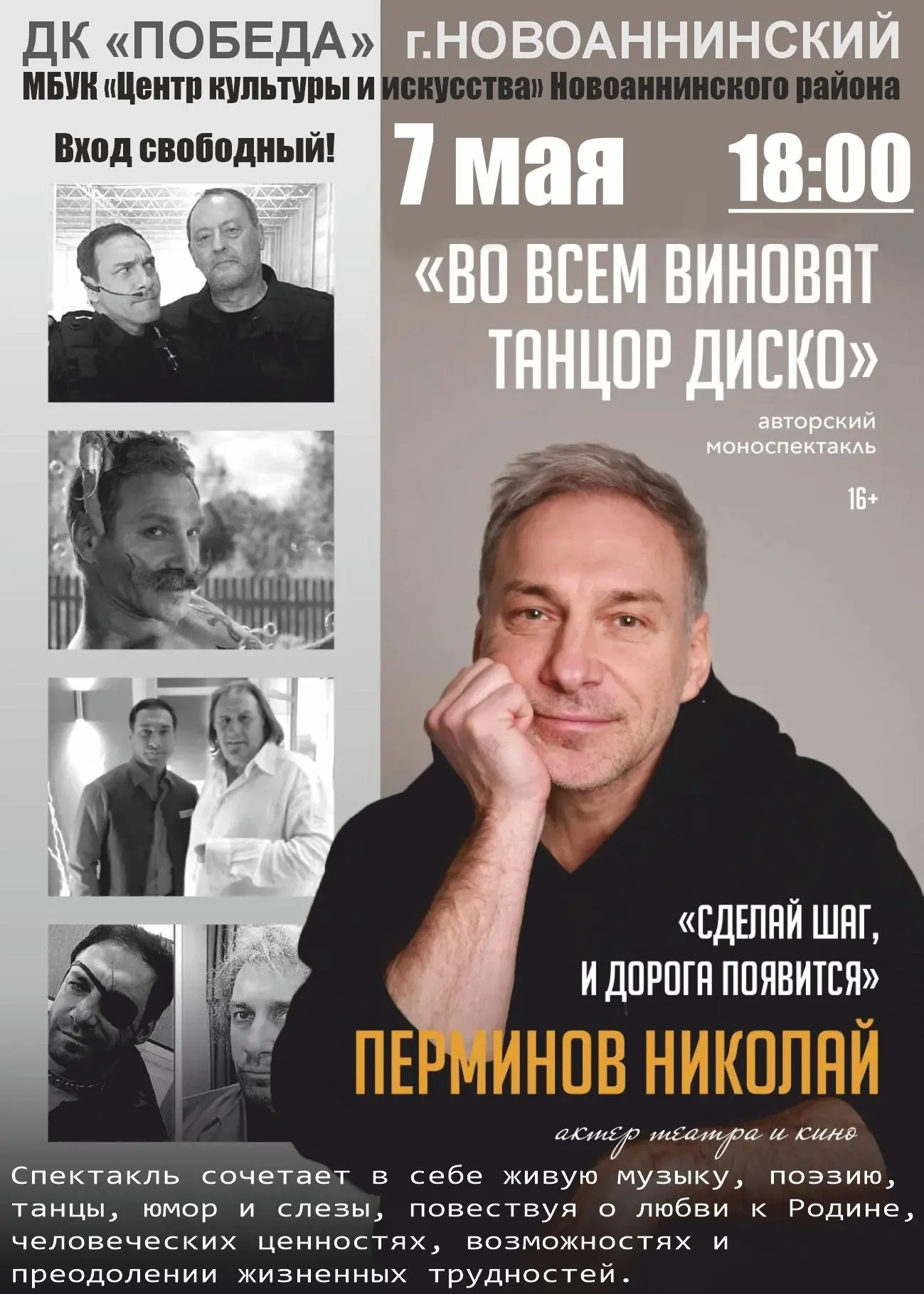 6 и 7 мая во Дворце культуры «Победа» пройдут авторские спектакли актера театра и кино Николая Перминова под названием: «Верь в себя» и моноспектакль «Во всем виноват танцор диско».