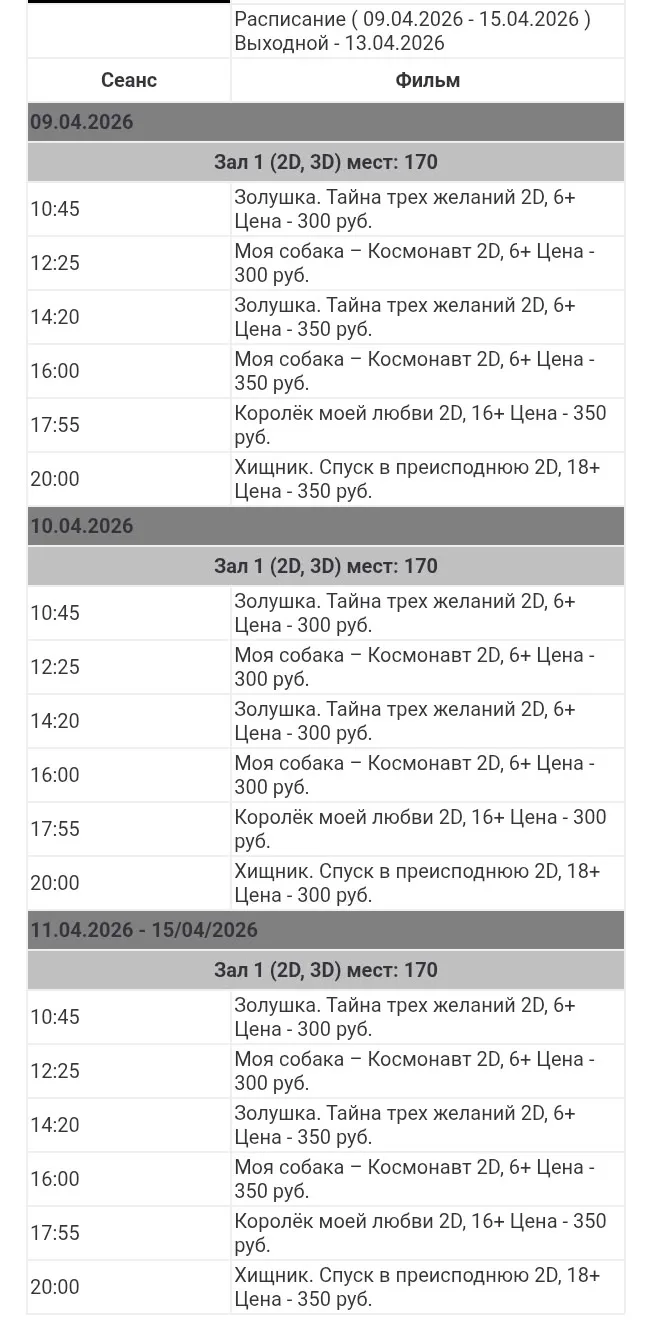 С 09 апреля кинотеатр РОДИНА приглашает на новинки кино: фильм "МОЯ СОБАКА -КОСМОНАВТ" и мультфильм фэнтези "ЗОЛУШКА.ТАЙНА ТРЁХ ЖЕЛАНИЙ"