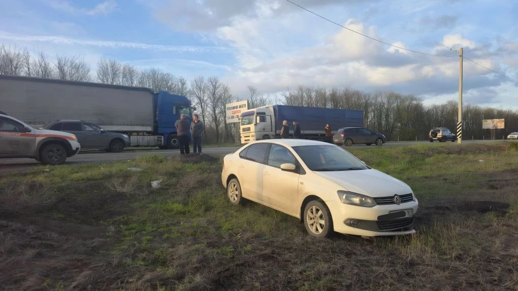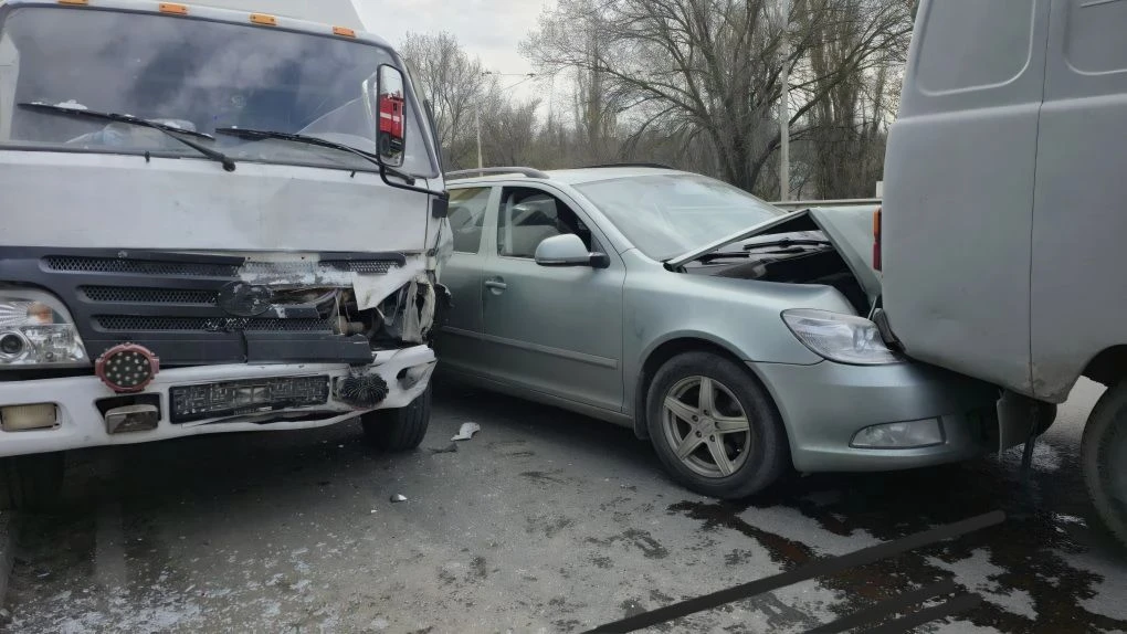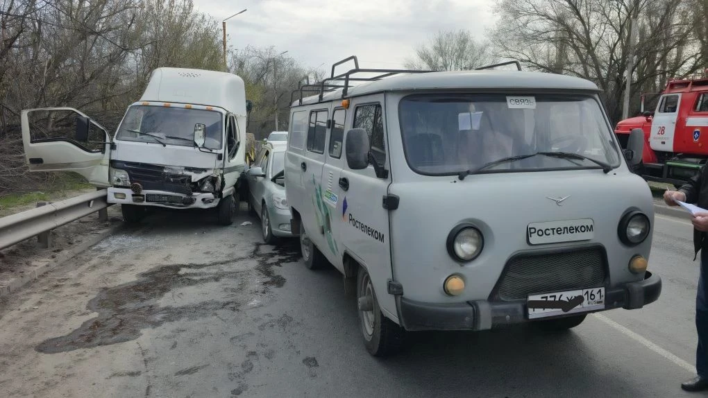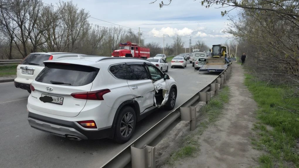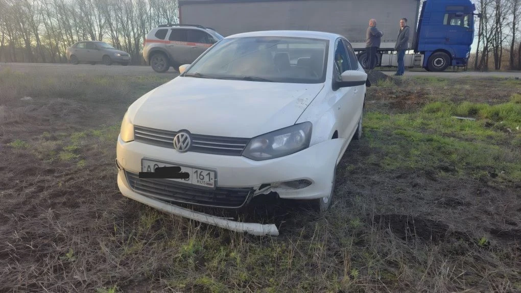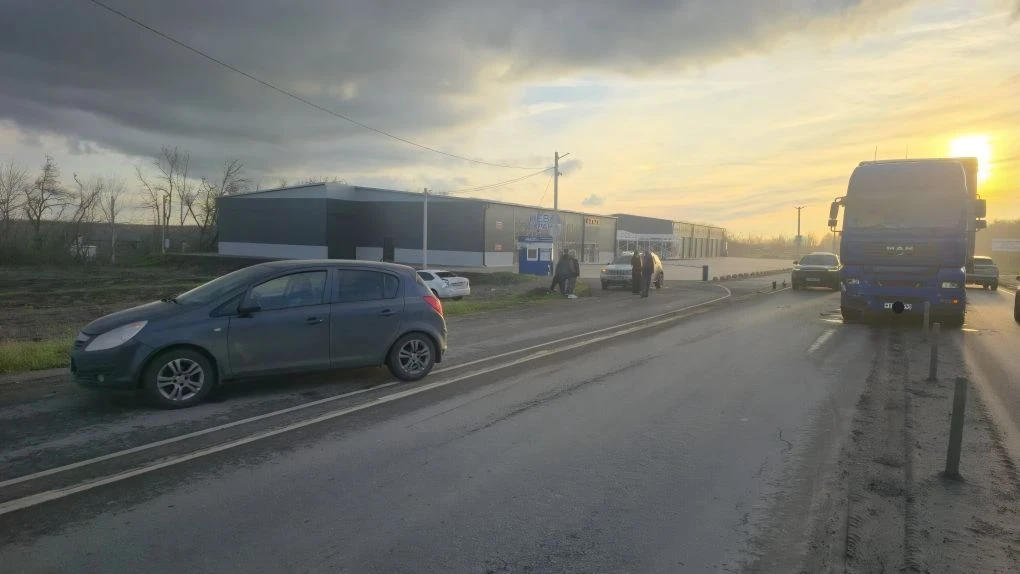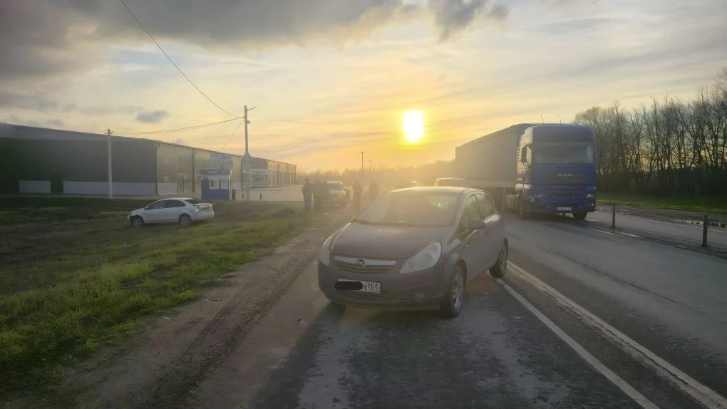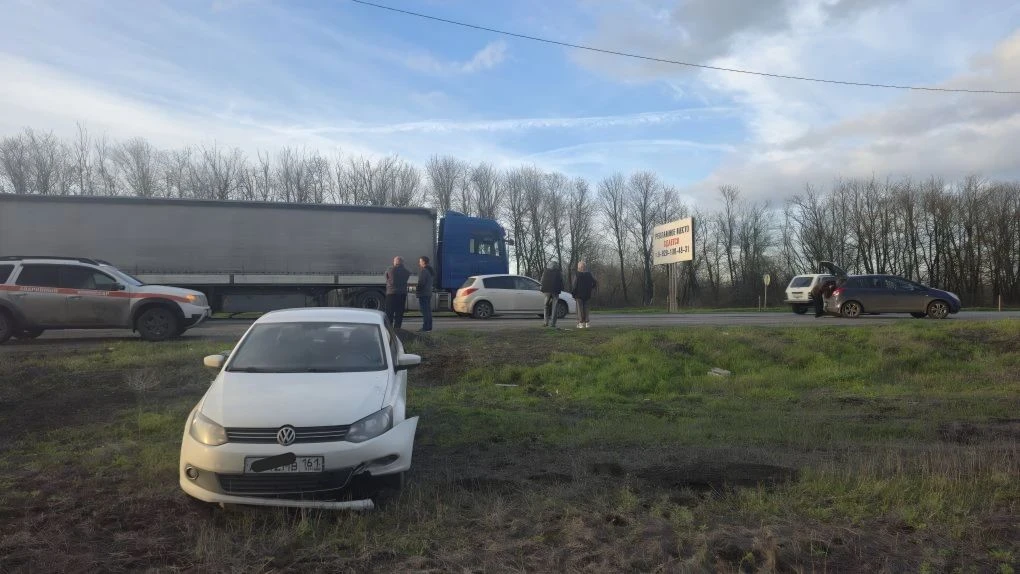 На въезде в Новочеркасск водитель фуры отвлёкся и снёс Фольксваген, который в свою очередь зацепил Опель.