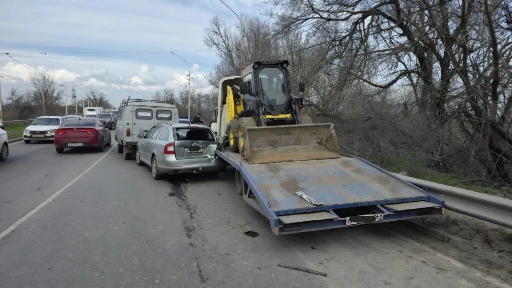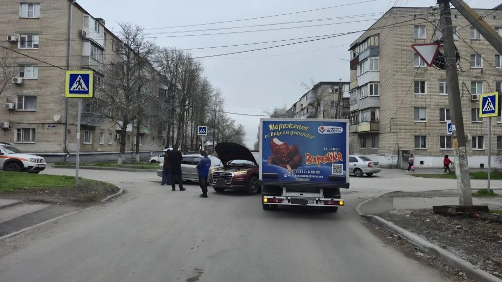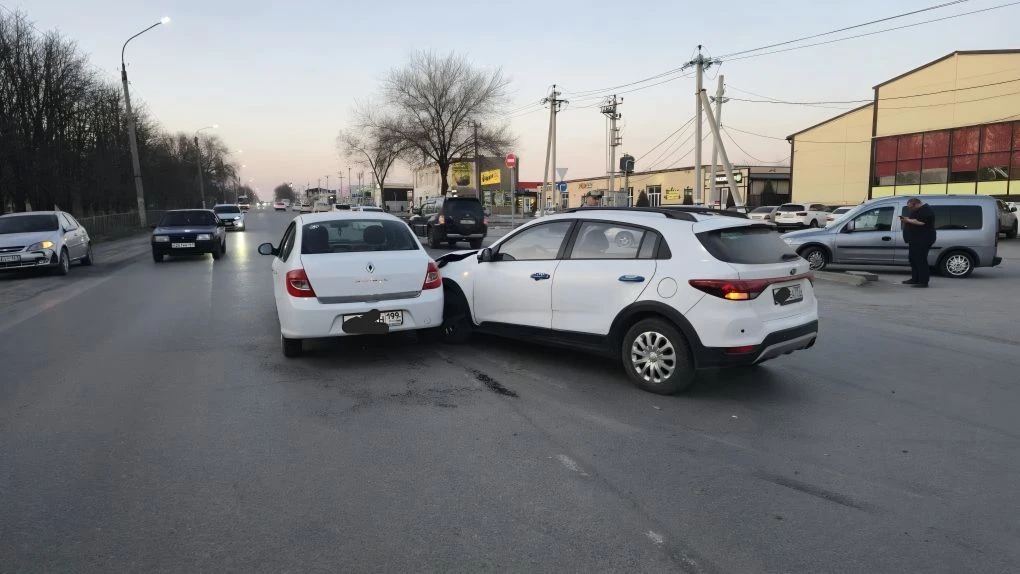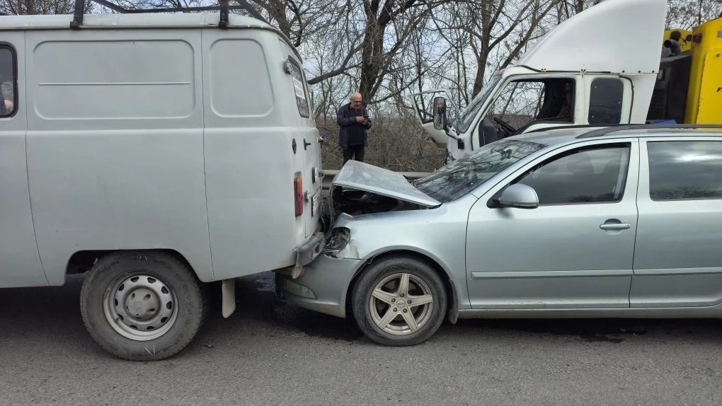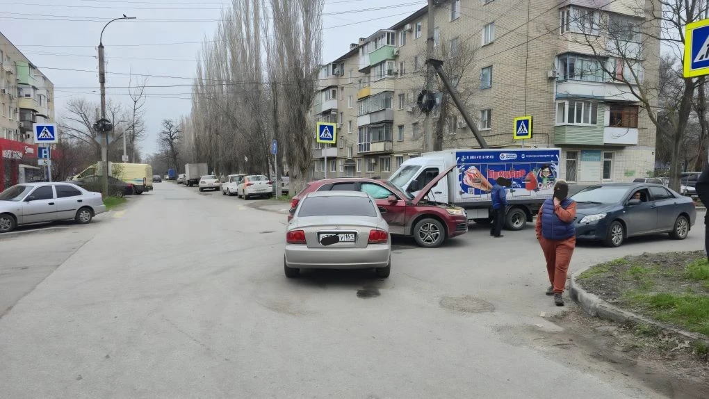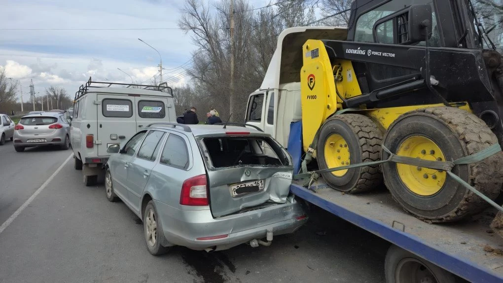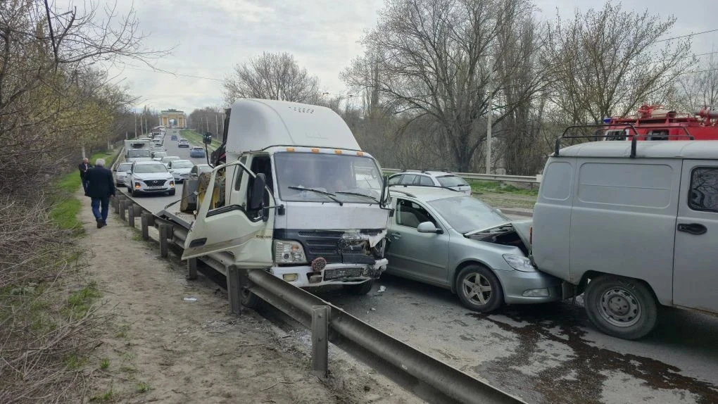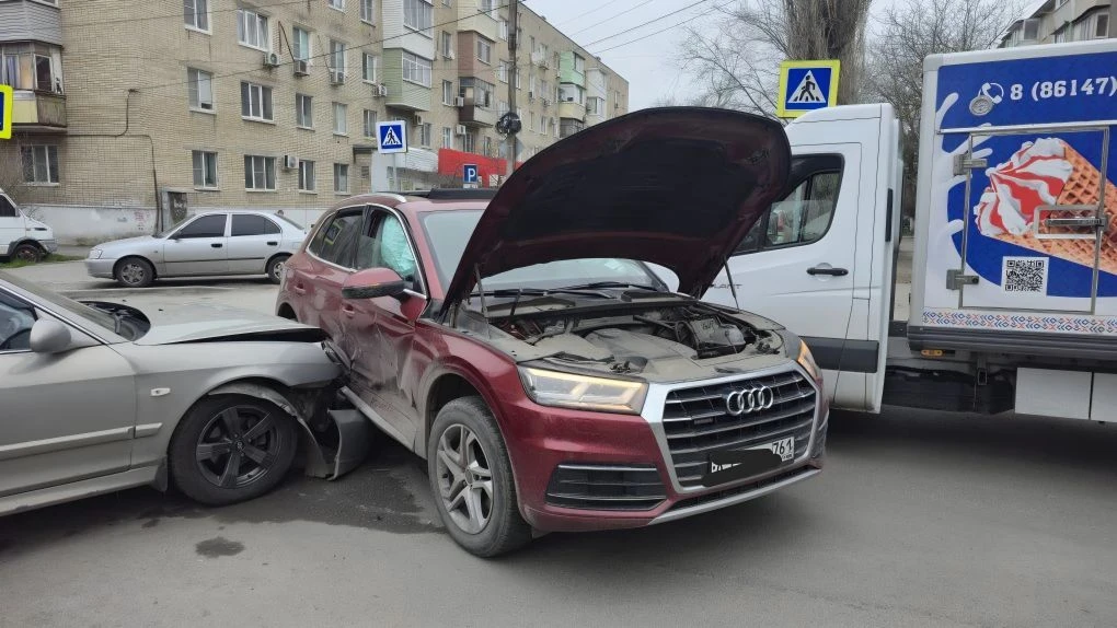 На въезде в Новочеркасск водитель фуры отвлёкся и снёс Фольксваген, который в свою очередь зацепил Опель.