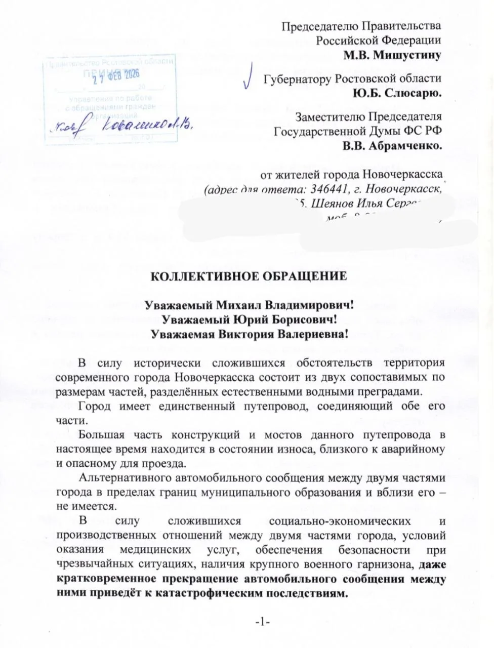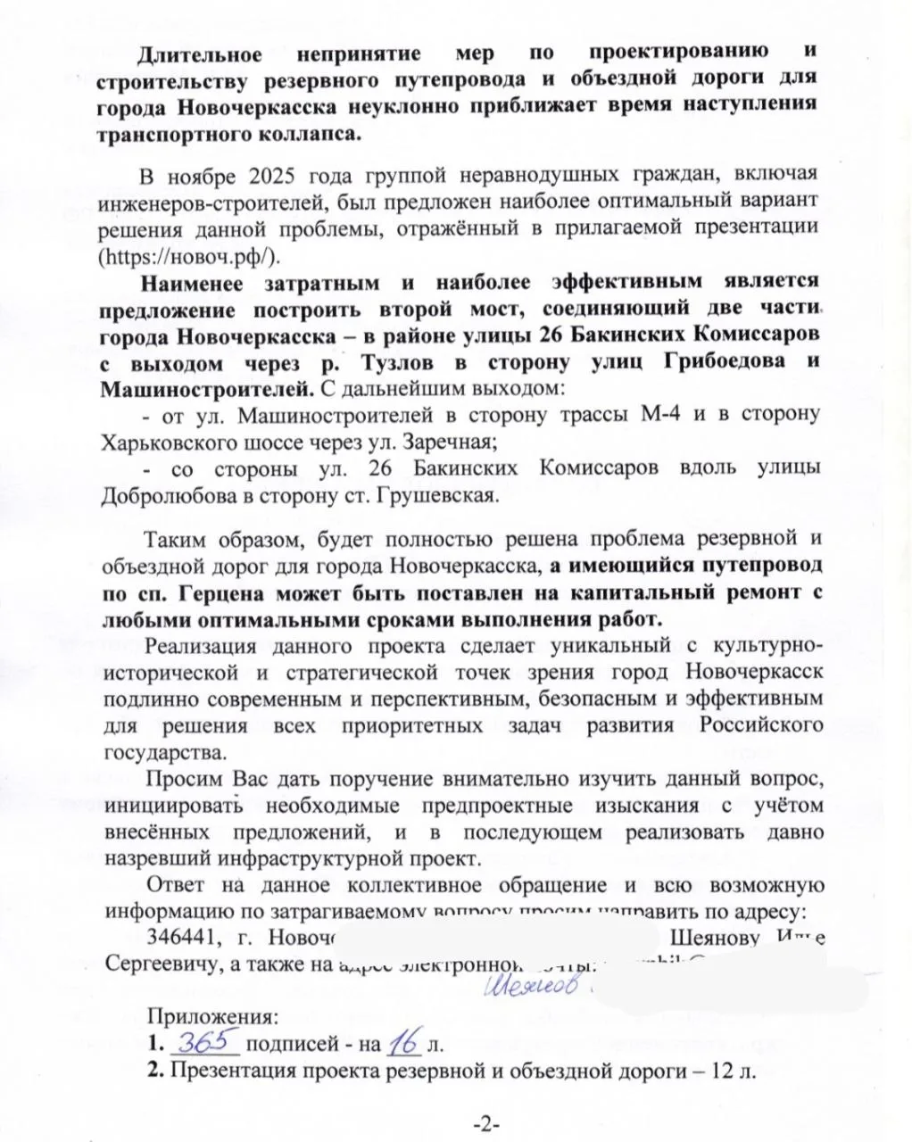 Жители Новочеркасска не стали ждать решений «сверху» и самостоятельно инициировали проработку важного инфраструктурного проекта. Коллективное обращение с детальной 12-страничной презентацией было направлено в адрес: