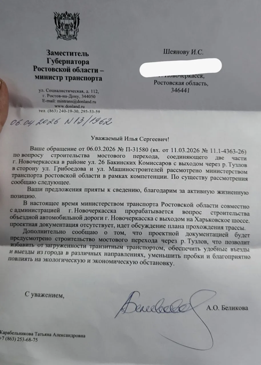 Министерство транспорта Ростовской области совместно с администрацией Новочеркасска подтвердили активность по направлению. В письме № 13/1822 от 26 марта 2026 года за подписью министра Алёны Беликовой указано: