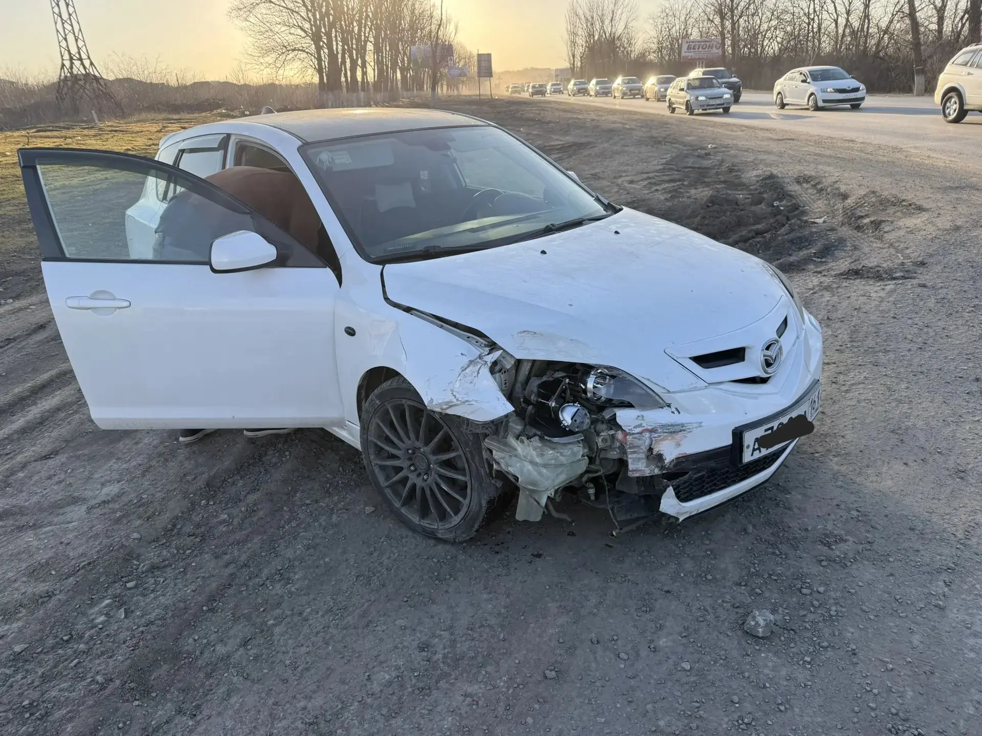 Автомобиль Шевроле двигался из города и поворачивал налево, в сторону улицы Металлургов. Мазда неслась по обочине в сторону города, объезжая все автомобили в заторе. Результат как всегда.