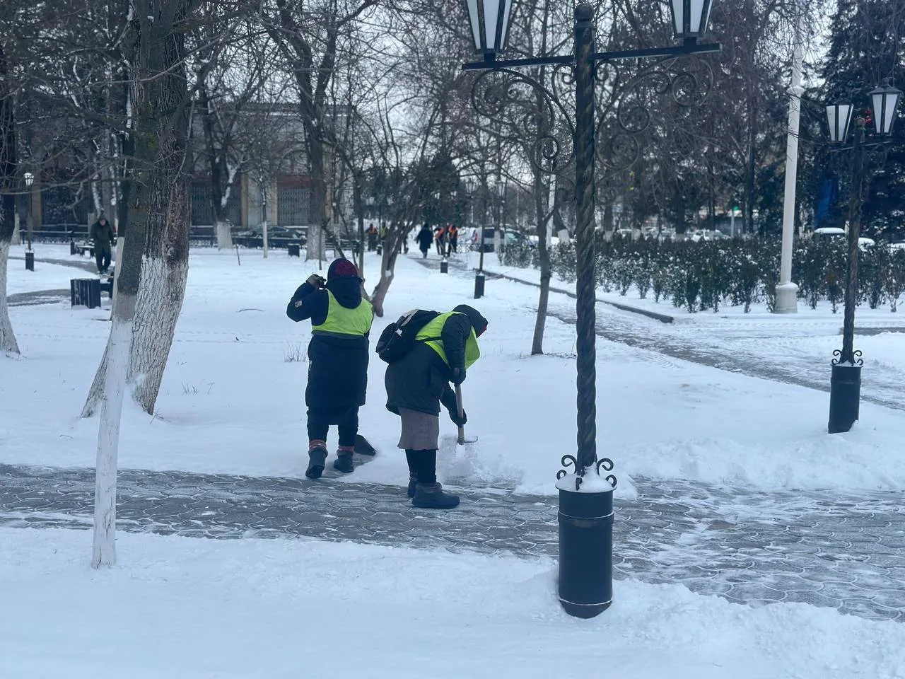 Уборка снега в Новочеркасске продолжается в режиме 24/7. По просьбе жителей, на площади Троицкой расширили расчищенную часть тротуара.