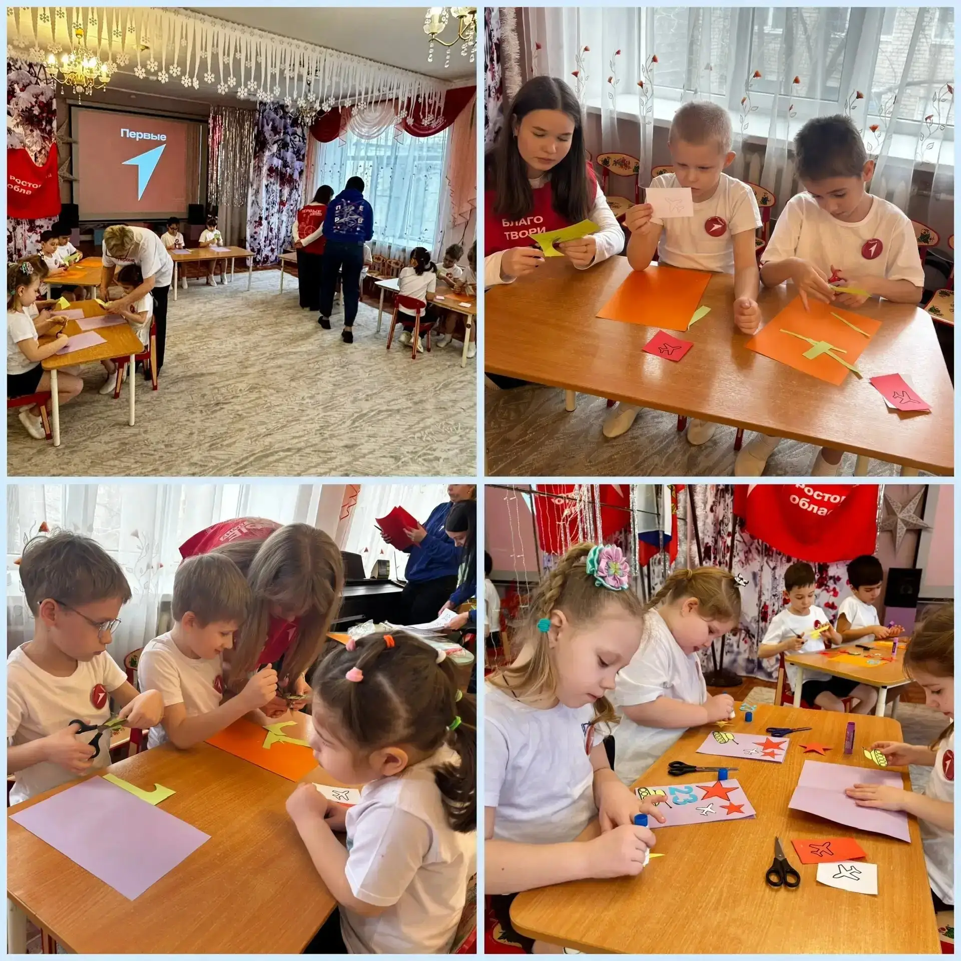 Старшеклассники вместе с воспитанниками детского сада изготавливали праздничные открытки: вырезали детали, собирали композиции и украшали изделия. Мероприятие организовано местным отделением Движения «Первые» как часть просветительской работы с детьми младшего возраста.
