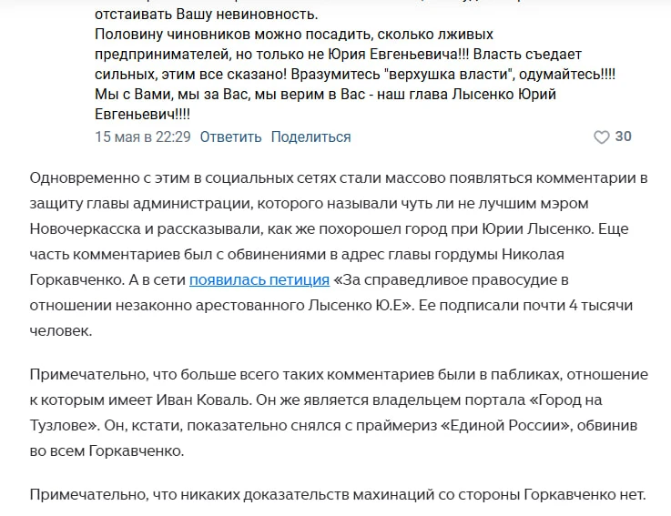 Я про вторую часть этой статьи, в которой говорится, что большинство комментариев поддержки в адрес Лысенко, а их очень много было, сокрушается автор, находятся в соцсетях в пабликах, к которым имеет отношение Иван Коваль. Подчеркиваю: не публикаций, а комментариев под публикациями.