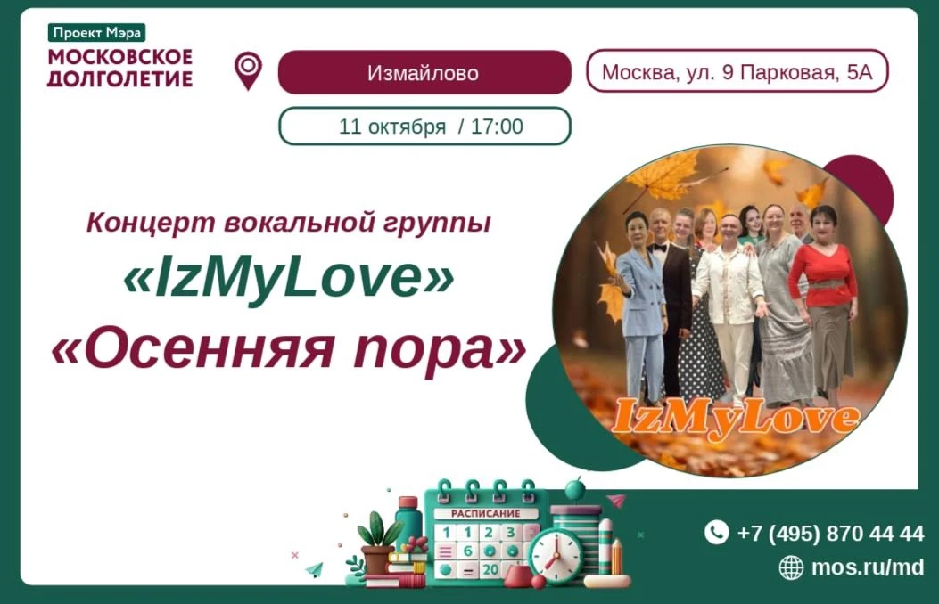 На следующий день, 11 октября в 17:00, зрителей ждет концертная программа «Осенняя пора» в исполнении популярной вокальной группы «IzMyLove». Коллектив представит лирические композиции, созвучные настроению золотой осени.