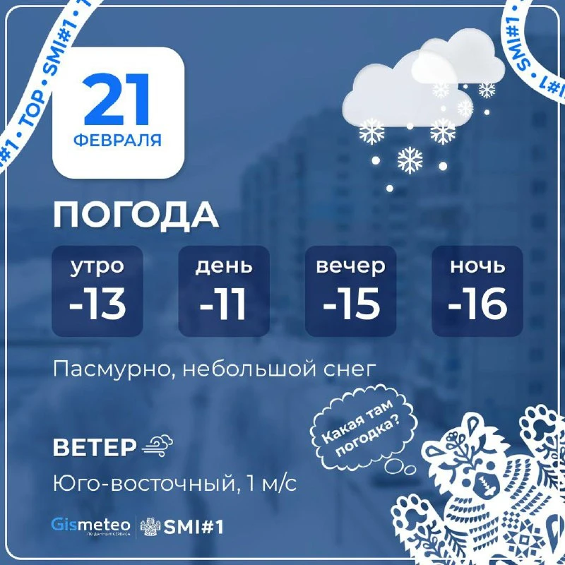 Синоптики прогнозируют снег. Днем температура составит -11 градусов. Вечером похолодает до -15°. Ветер слабый — 1 м/с.