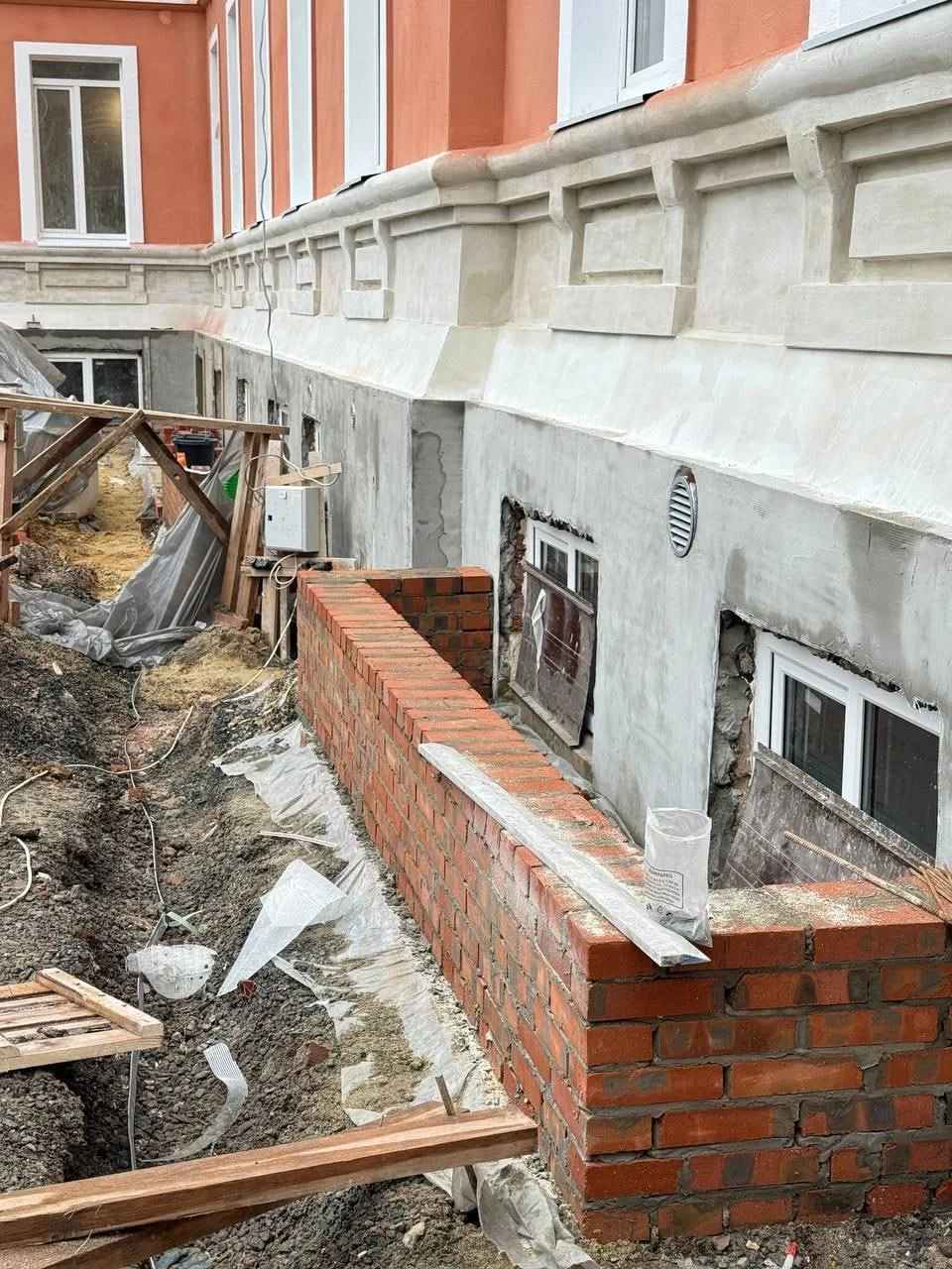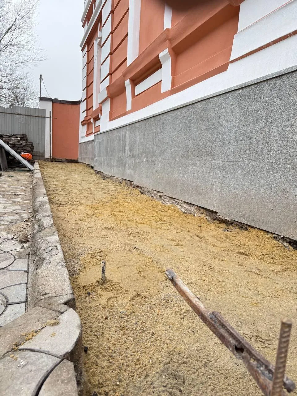 Строители начали бетонирование отмостки здания, а также входных групп.