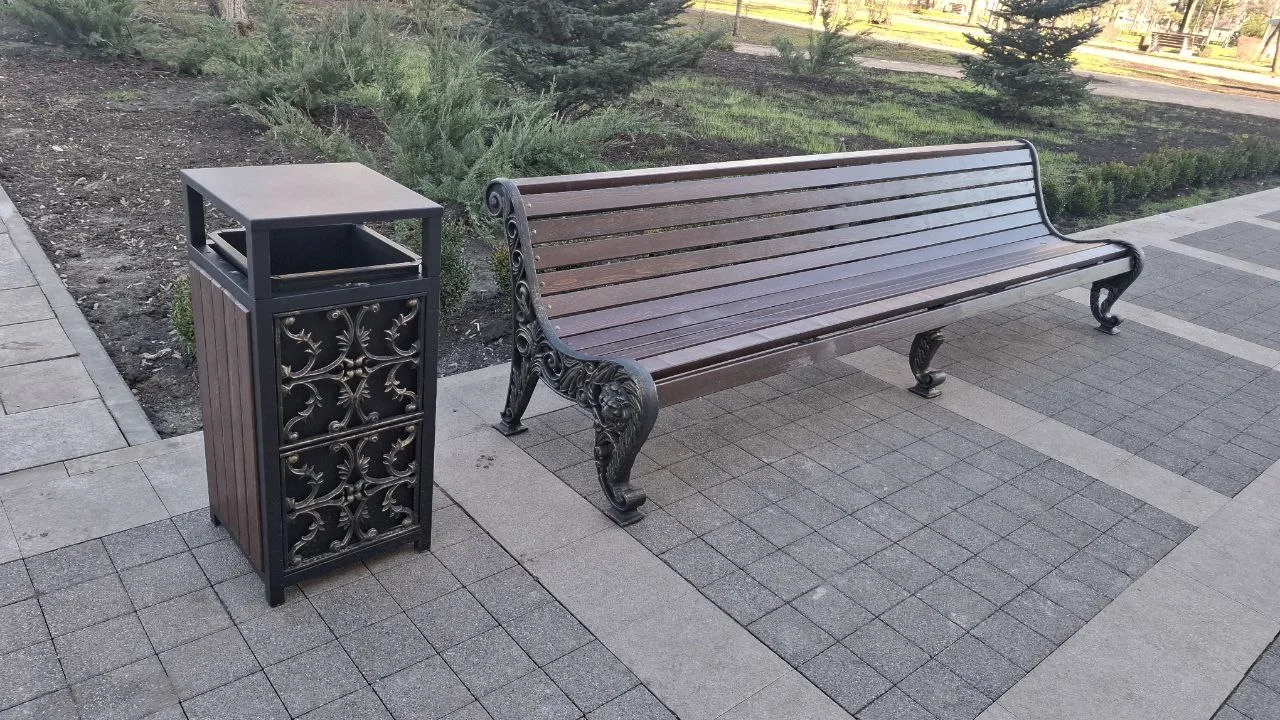 По бокам Драмтеатра установили красивые лавочки и урны с гравировкой.