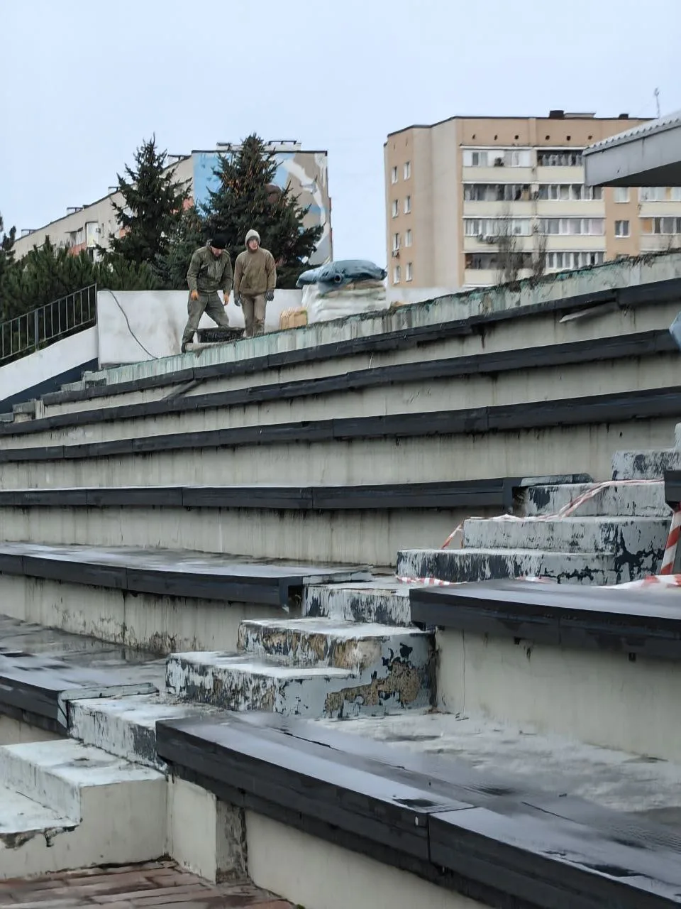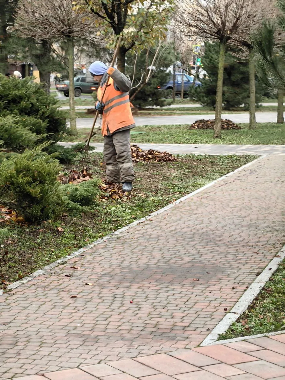 Площадь Ленина и прилегающую к ней зелёную зону готовят к праздникам. Ремонтируют ступени, работники Зеленстроя очищают газоны от осенней листвы.