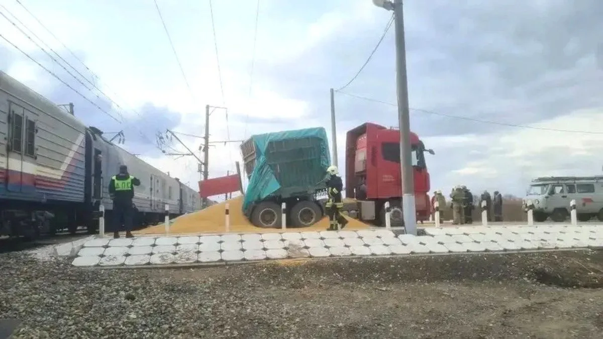 Момент столкновения поезда Владивосток - Москва и фуры с зерном.
