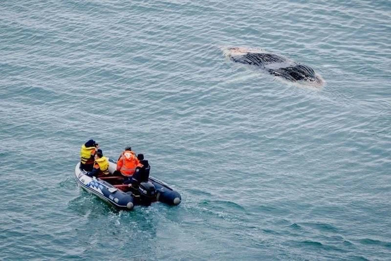 Погибшего горбатого кита, выброшенную на дикий пляж в бухте Мусатова, спасатели отбуксировали подальше от берега. По оценкам специалистов, тело морского млекопитающего могло находиться в воде до нескольких месяцев