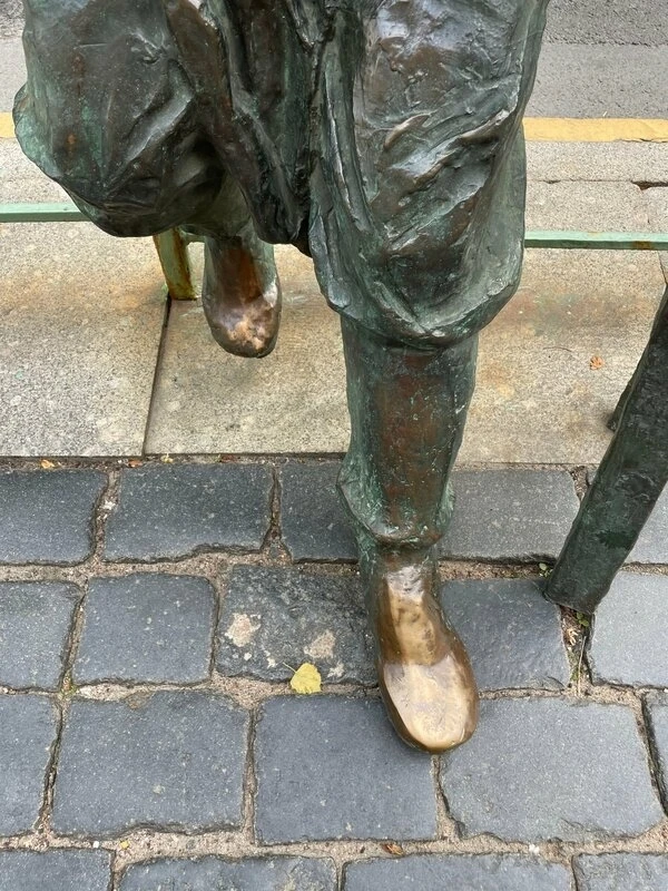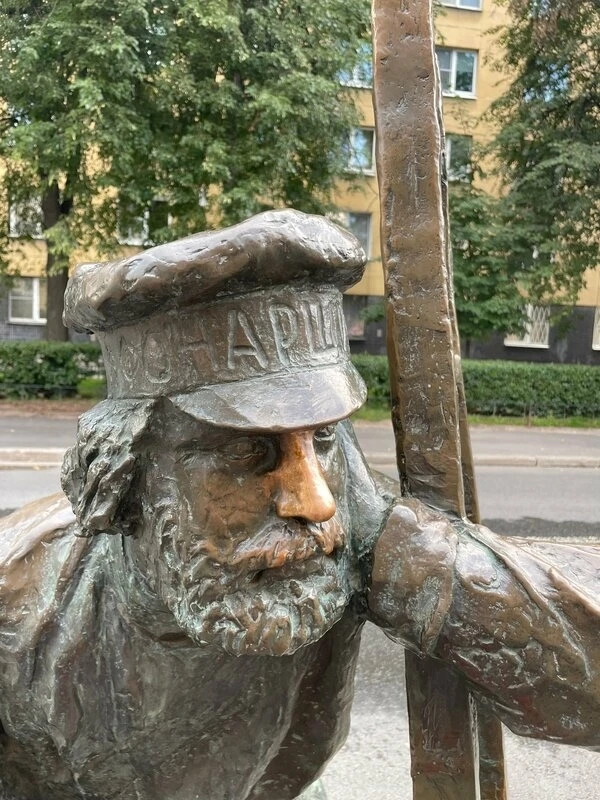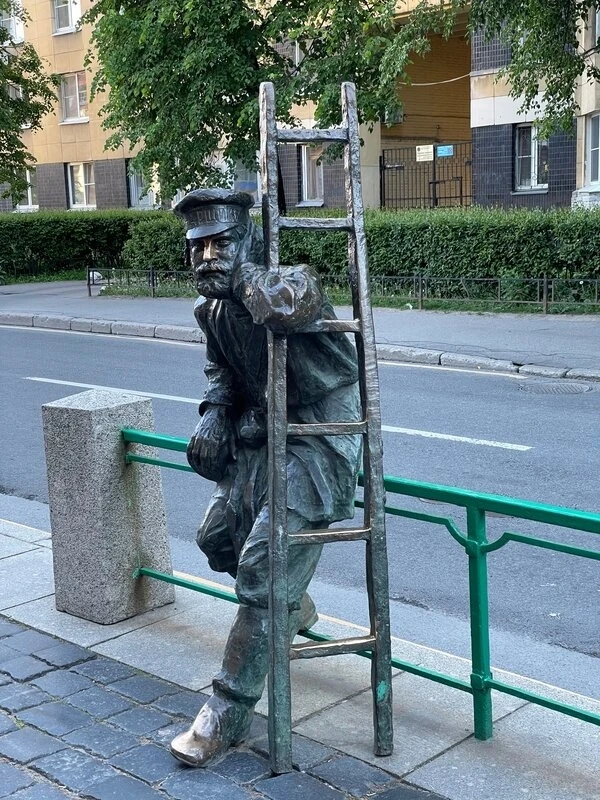 Бронзовый фонарщик выглядит уставшим: присел на ограждение, опёрся на лестницу и задумчиво смотрит из-под фуражки. Место выбрано символично — именно здесь в 1873 году впервые зажёгся электрический фонарь Лодыгина. Рядом — небольшой «музей фонарей» под открытым небом.