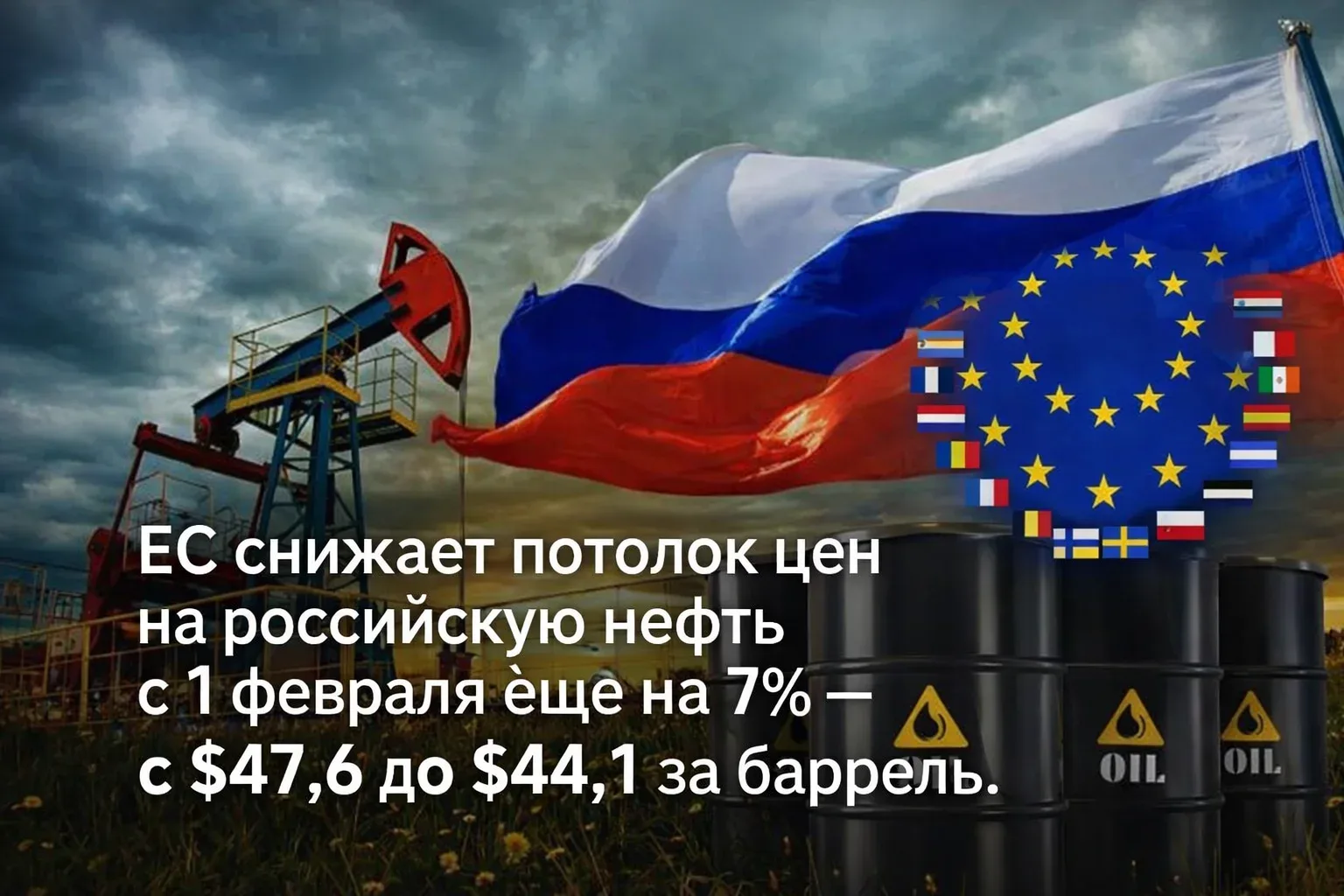 ЕС снижает потолок цен на российскую нефть с 1 февраля ещё на 7% — с $47,6 до $44,1 за баррель.