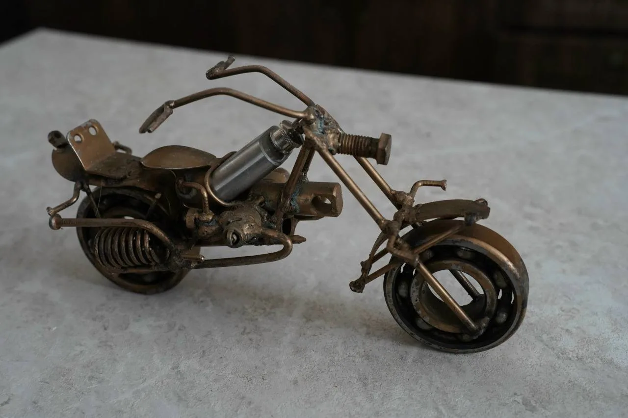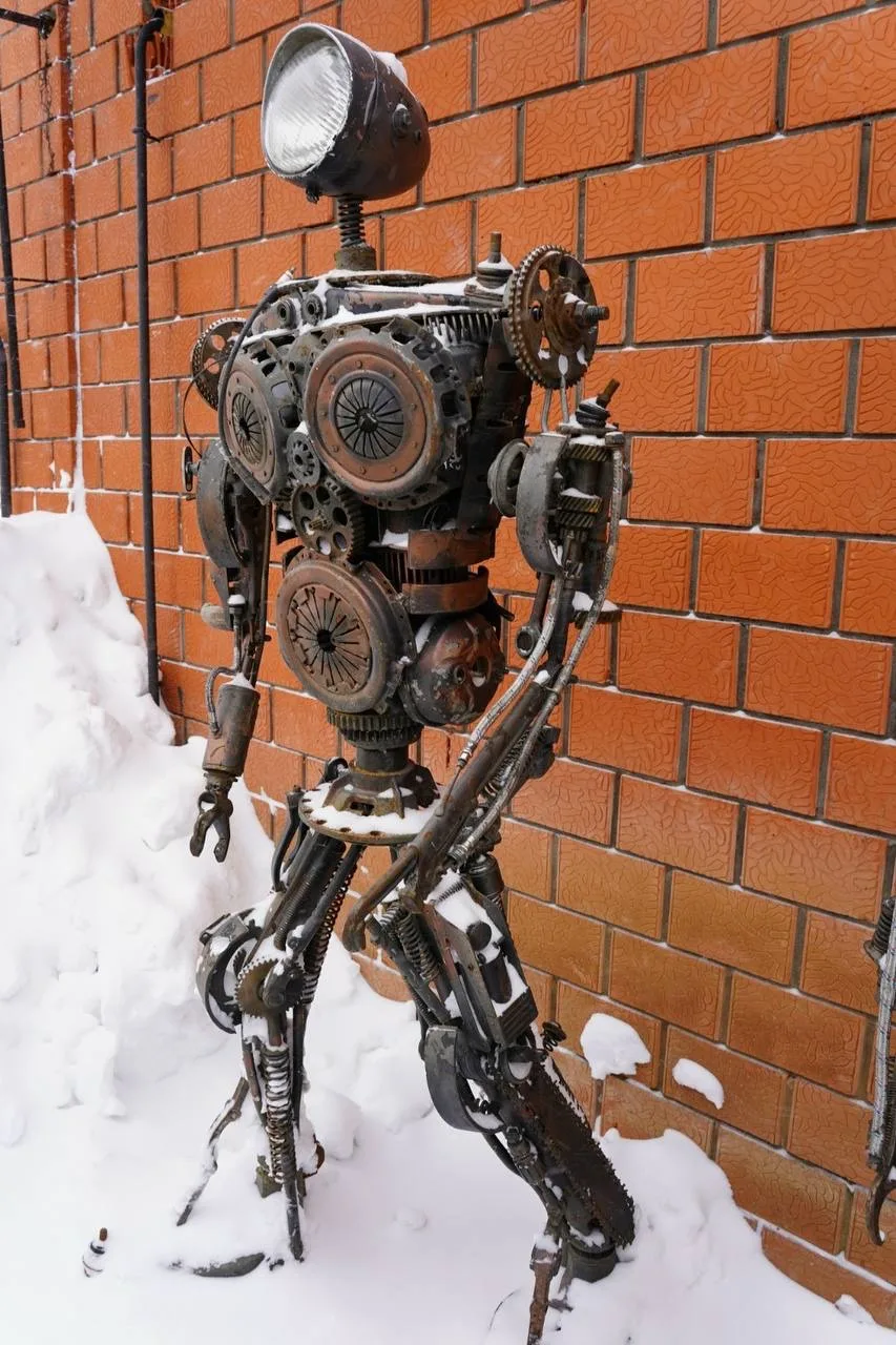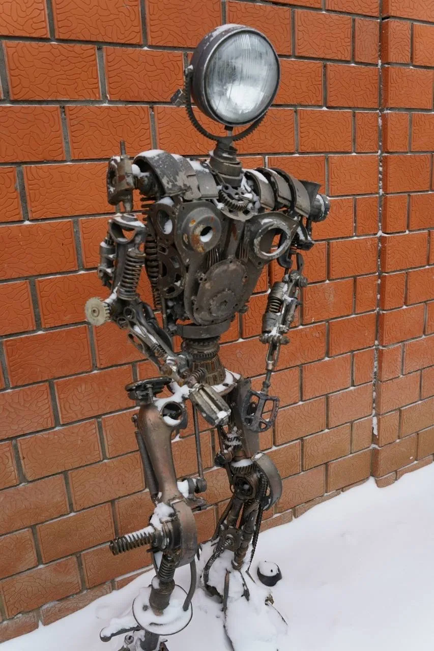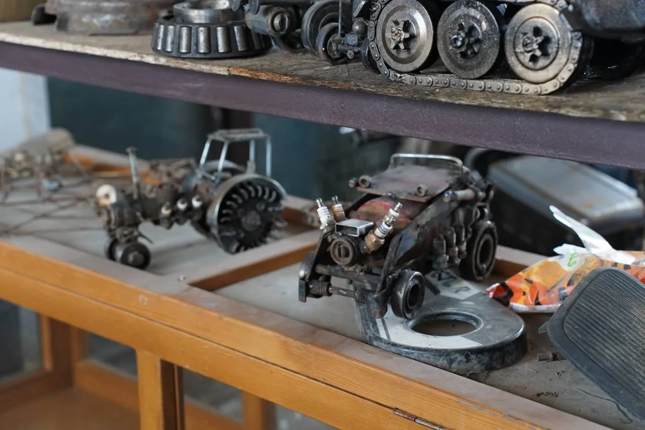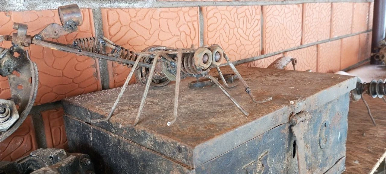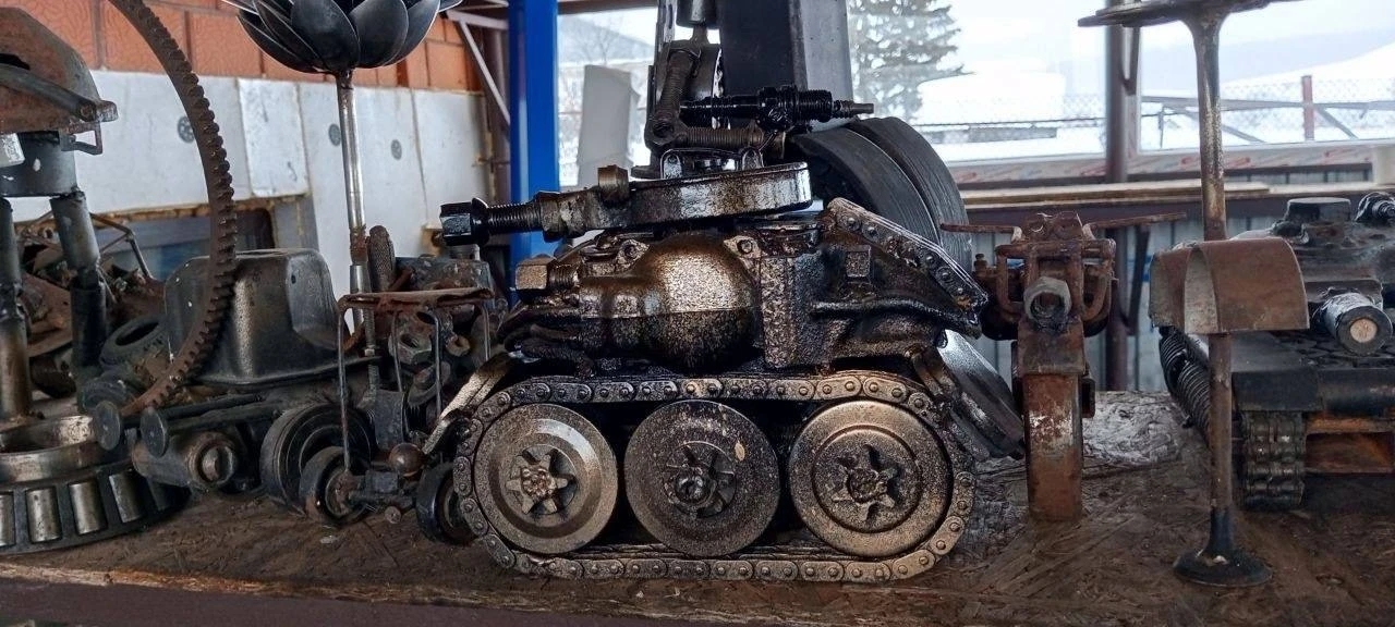 Сейчас во дворе храма — целая галерея из металлолома. Вот семья: мама из деталей швейной машинки, миксера и утюгов, папа — из газового ключа, насоса и пилы. Внутри — танки, птеродактиль, динозавр, мотоциклы, самолёты, тракторы, паук из уличного фонаря, цветы из ложек и вентилятора, рокер из газового баллончика.