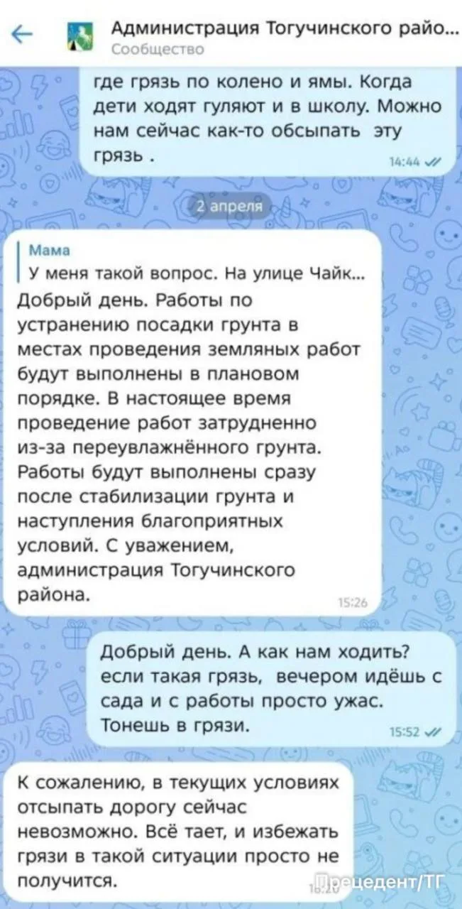 После огласки самую большую яму закопали и огородили, но остались другие опасные провалы. Жители обращались в администрацию, но там сообщили, что работы проведут позже — сейчас мешают переувлажнённые грунты. Мама мальчика просит срочно устранить угрозу: трагедия может повториться — в 2018 году в Колывани из‑за подобной ямы погибли двое детей.
