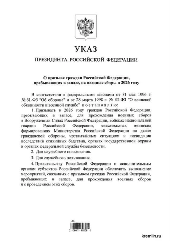 ⏺Путин подписал указ о призыве россиян, пребывающих в запасе, на военные сборы в 2026 году