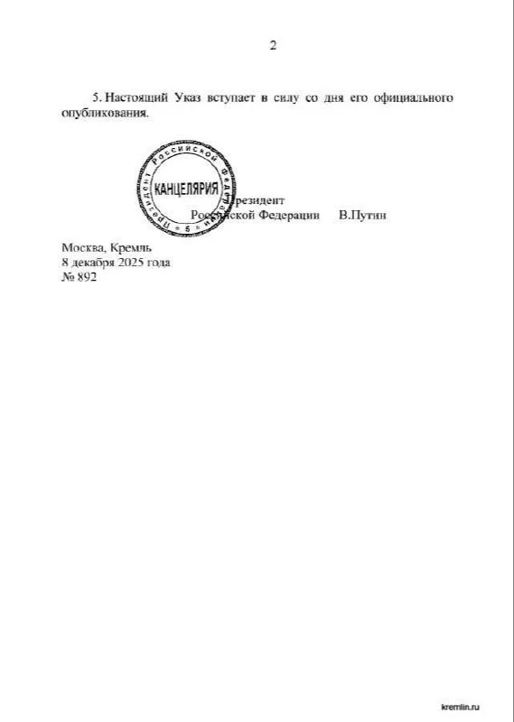 Указ вступает в силу с 8 декабря. Об этом сообщает пресс-служба Кремля.