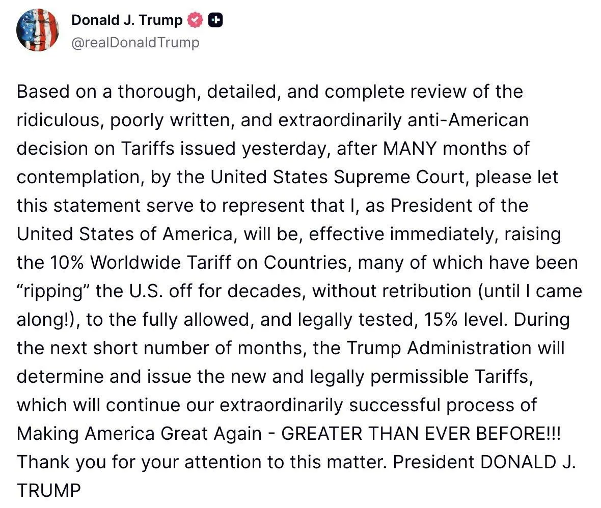 И вот только, что президент США заявил, что будет не 10, а 15% пошлина. Пошлины вступают в силу немедленно.
