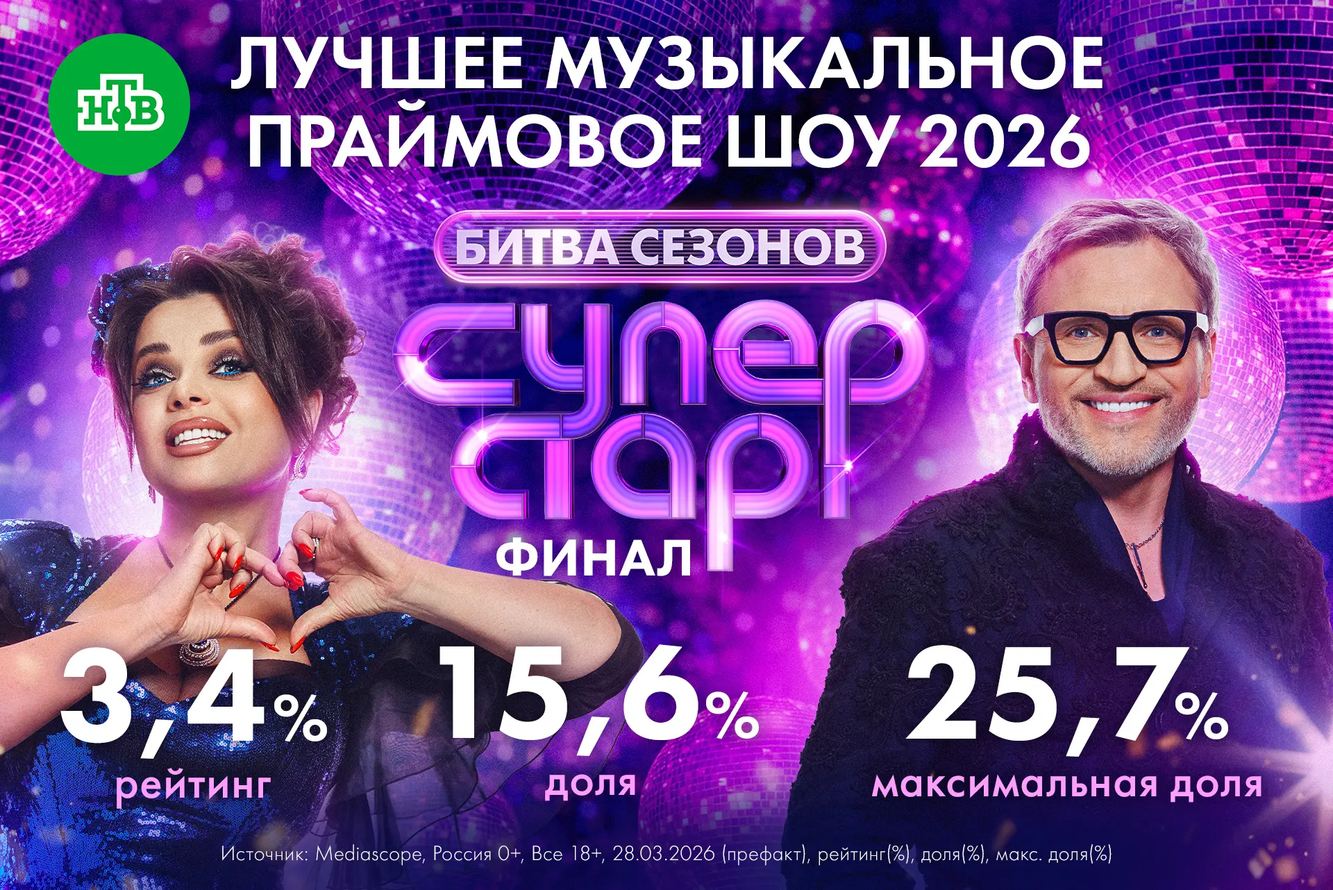 ⭐️ В конце января в эфире НТВ состоялась премьера музыкального шоу «Суперстар! Битва сезонов»: проект стал лучшим музыкальным шоу 2026 года со средним рейтингом 3,3% (доля 15,0%). Грандиозный финал «Суперстар! Битва сезонов», вышедший в эфир НТВ 28 марта, прошёл с долей 15,8%, максимального значения ― 25,8% ― доля достигла во время выноса кубка победителя Шуре.