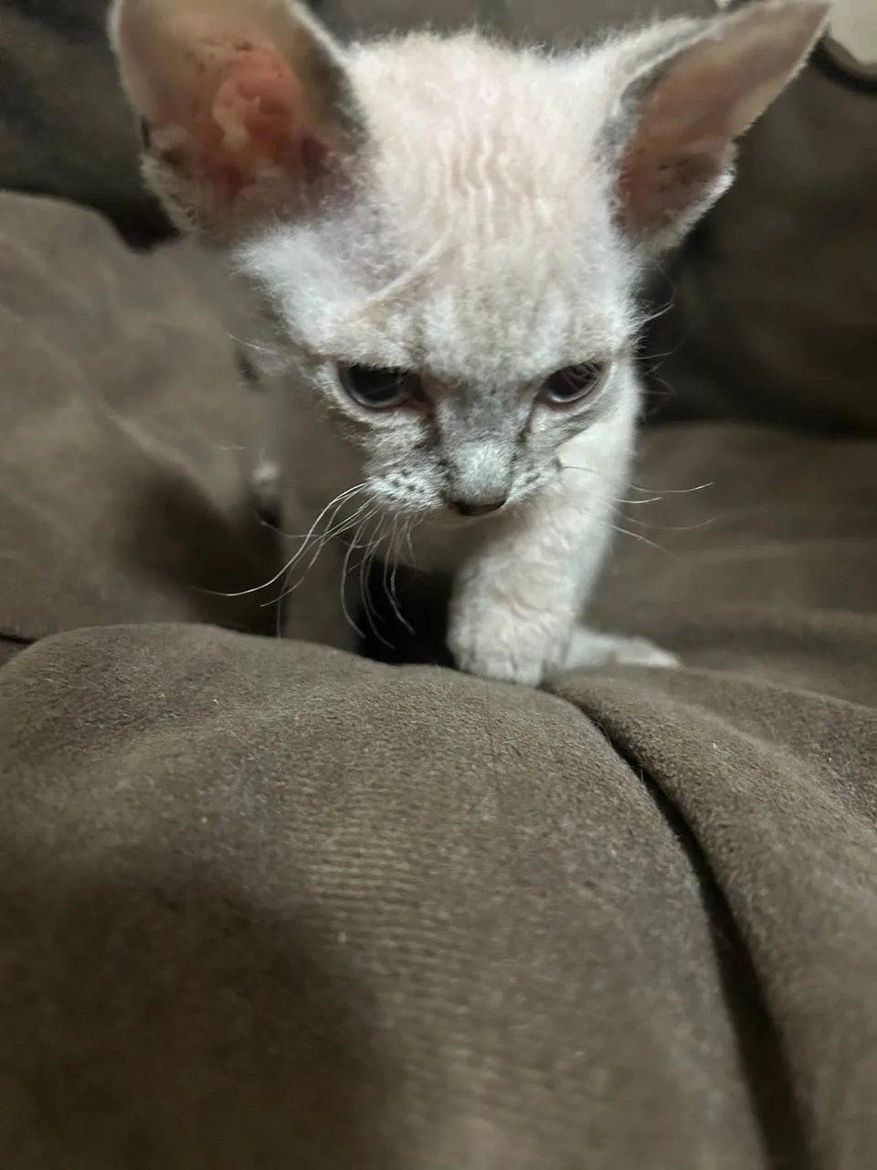 Белая спокойная, но имеет инвалидность задних лап (это никак не мешает бегать).