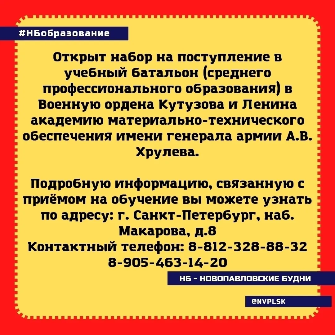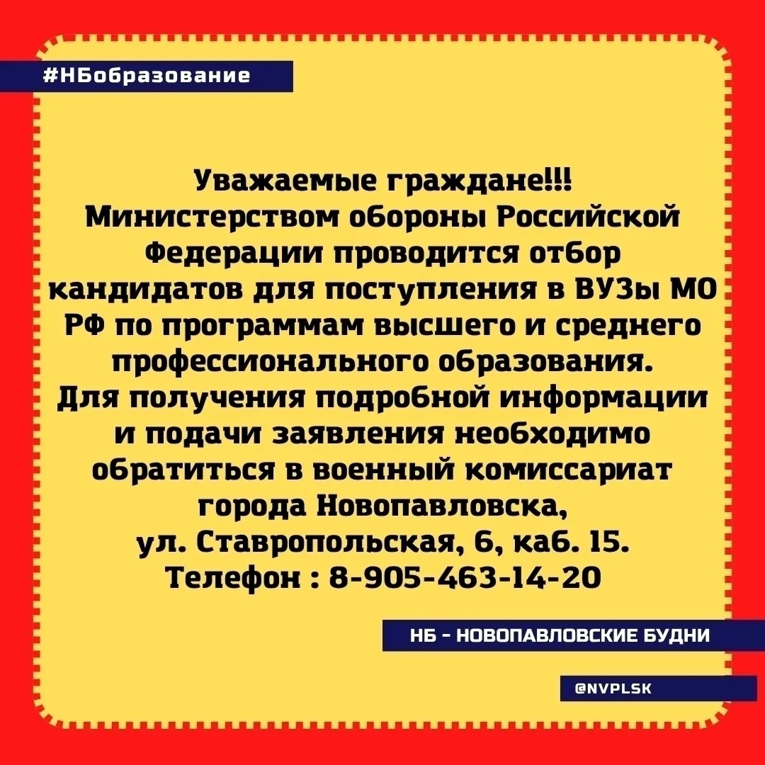 Желающим поступить в военное учебное заведение Министерства обороны России необходимо обратиться в военный комиссариат по адресу г. Новопавловск, ул. Ставропольская, д.6.