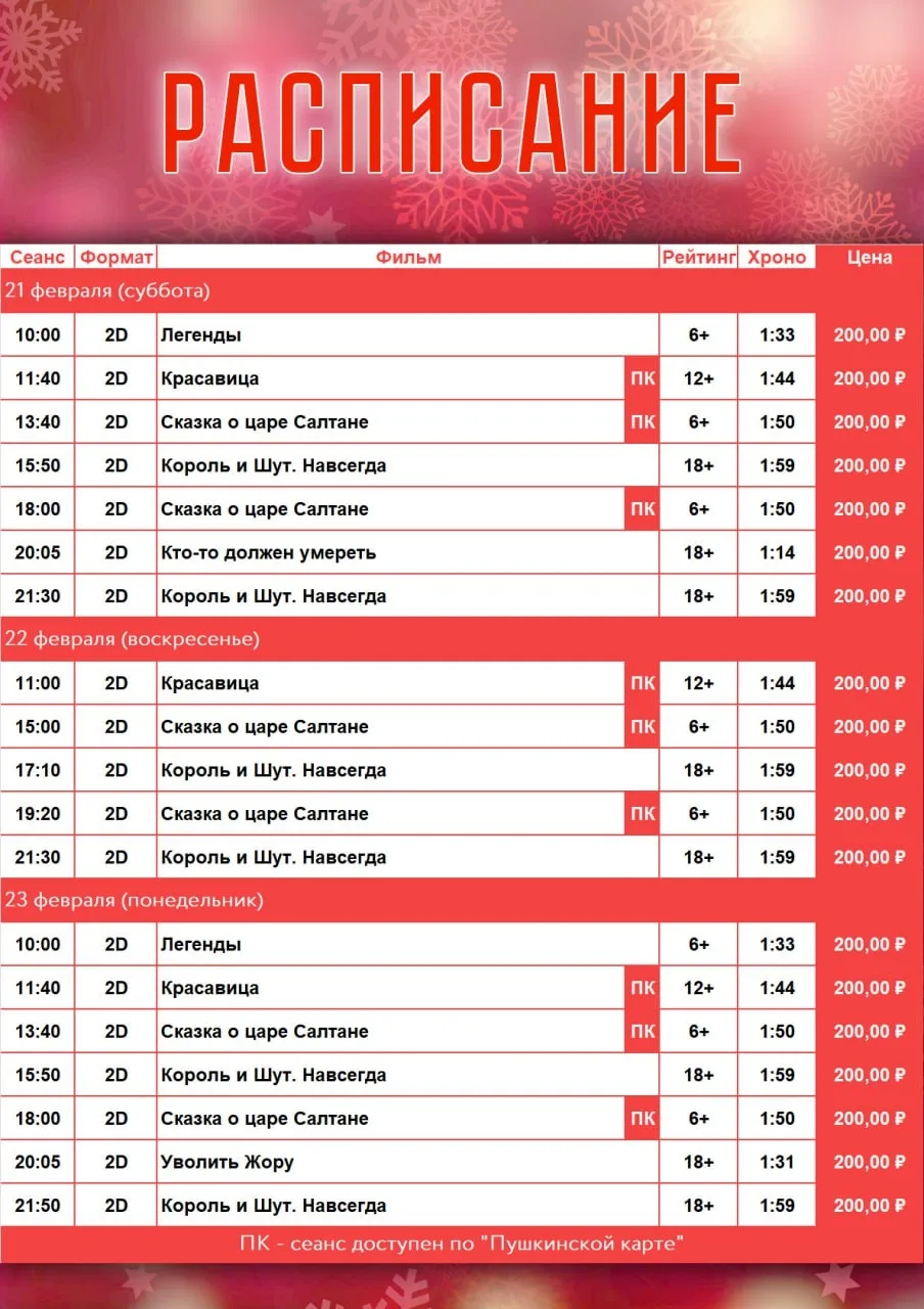Расписание кинотеатра "Победа" с 21 по 23 февраля.