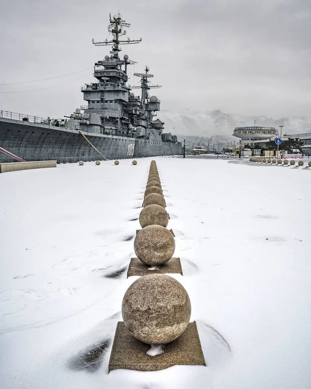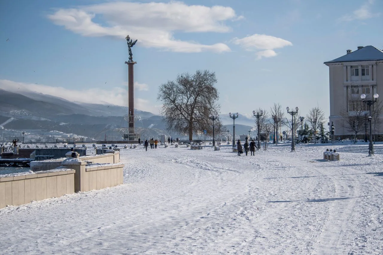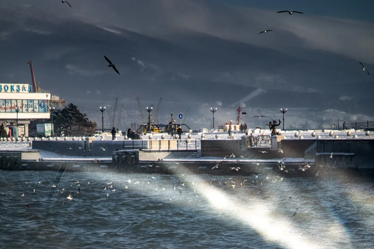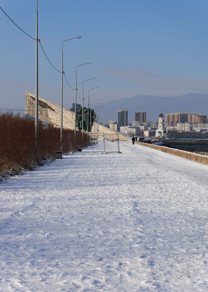 Нынешняя зима порадовала Новороссийск снегом. Столбик термометра показывает -6 градусов, но из-за сильного ветра, достигающего порывами 15 метров в секунду, ощущается как -14.