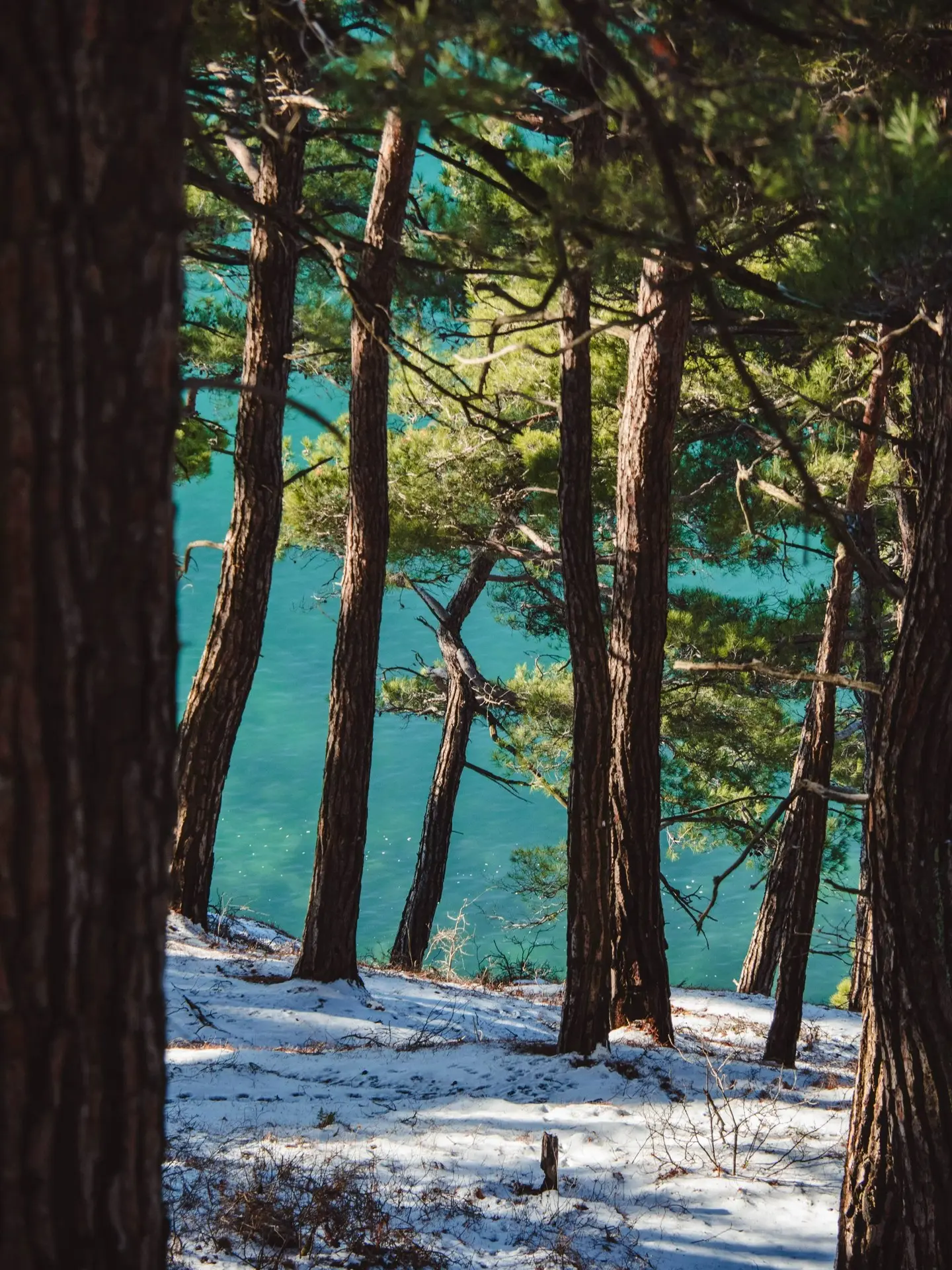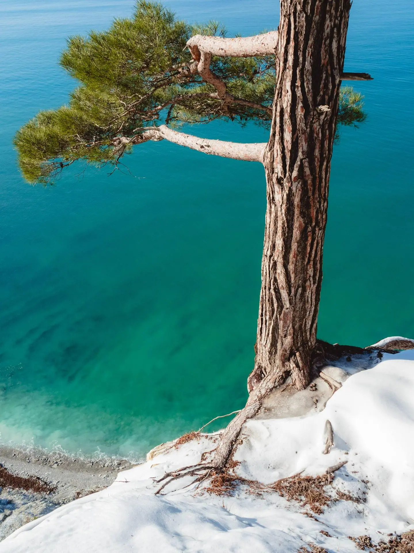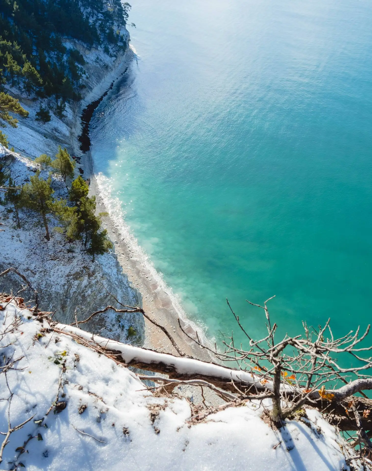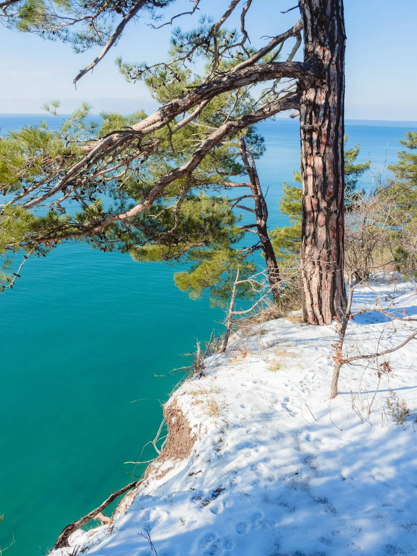 Тут навалило снега, как не было в этих местах, наверное лет 5. И теперь, и без того фантастически красивое место превратилось совсем уж в сказочное: белоснежный снег, изумрудные сосны и бирюзовое море.